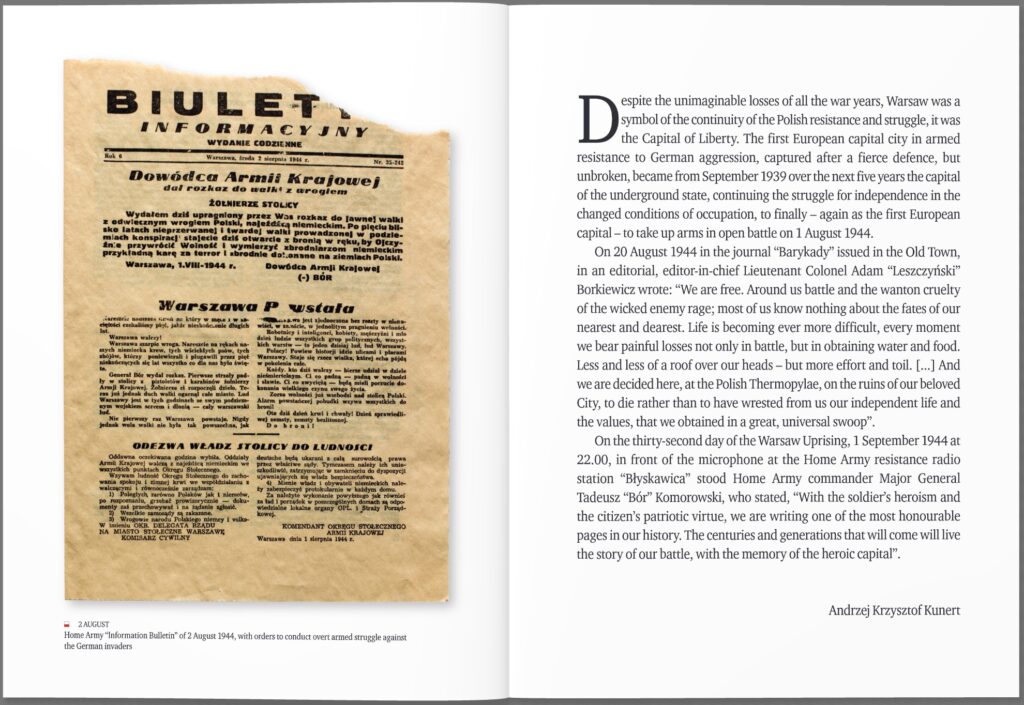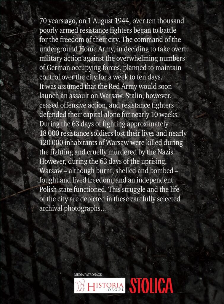 70 years ago, on 1 August 1944, over ten thousand poorly armed resistance fighters began to battle for the freedom of their city. The command of the underground Home Army, in deciding to take overt military action against the overwhelming numbers of German occupying forces, planned to maintain control over the city for a week to ten days. It was assumed that the Red Army would soon launch an assault on Warsaw. Stalin, however, ceased offensive action, and resistance fighters defended their capital alone for nearly 10 weeks. During the 63 days of fighting approximately 18 000 resistance soldiers lost their lives and nearly 120 000 inhabitants of Warsaw were killed during the fighting and cruelly murdered by the Nazis. However, during the 63 days of the uprising, Warsaw – although burnt, shelled and bombed – fought and lived freedom, and an independent Polish state functioned. This struggle and the life of the city are depicted in these carefully selected archival photographs…