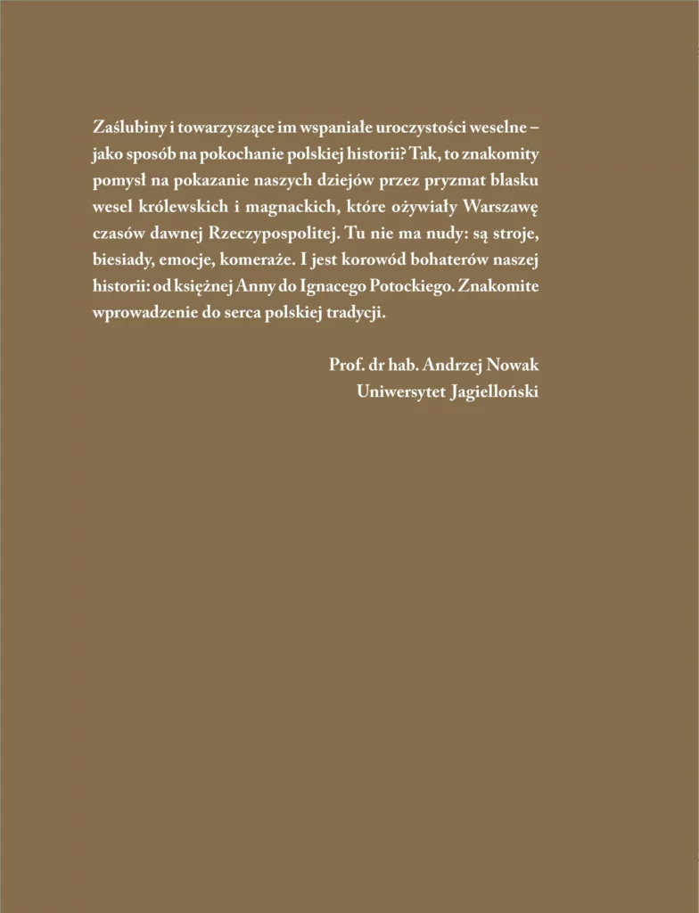 Barwna opowieść o słynnych ślubach i hucznych weselach, które przez wieki odbywały się w Warszawie – od czasów książąt mazowieckich, przez królewskie ceremonie, aż po polityczne mariaże epoki oświecenia. Jan Ostoja-Ostaszewski, historyk i dziennikarz, z reporterskim zacięciem pokazuje, jak miłość splatała się z polityką, a stołeczna etykieta – z obyczajami kolejnych epok. Oparta na źródłach, pamiętnikach i relacjach obcokrajowców publikacja odkrywa kulisy wydarzeń, które zapisały się w dziejach nie tylko miłosnych, ale i państwowych. Całość wzbogacona o liczne reprodukcje – to fascynujący przewodnik po historii Warszawy widzianej przez pryzmat weselnych ceremonii. Wyjątkowa pozycja dla miłośników historii, kultury i obyczajowości.