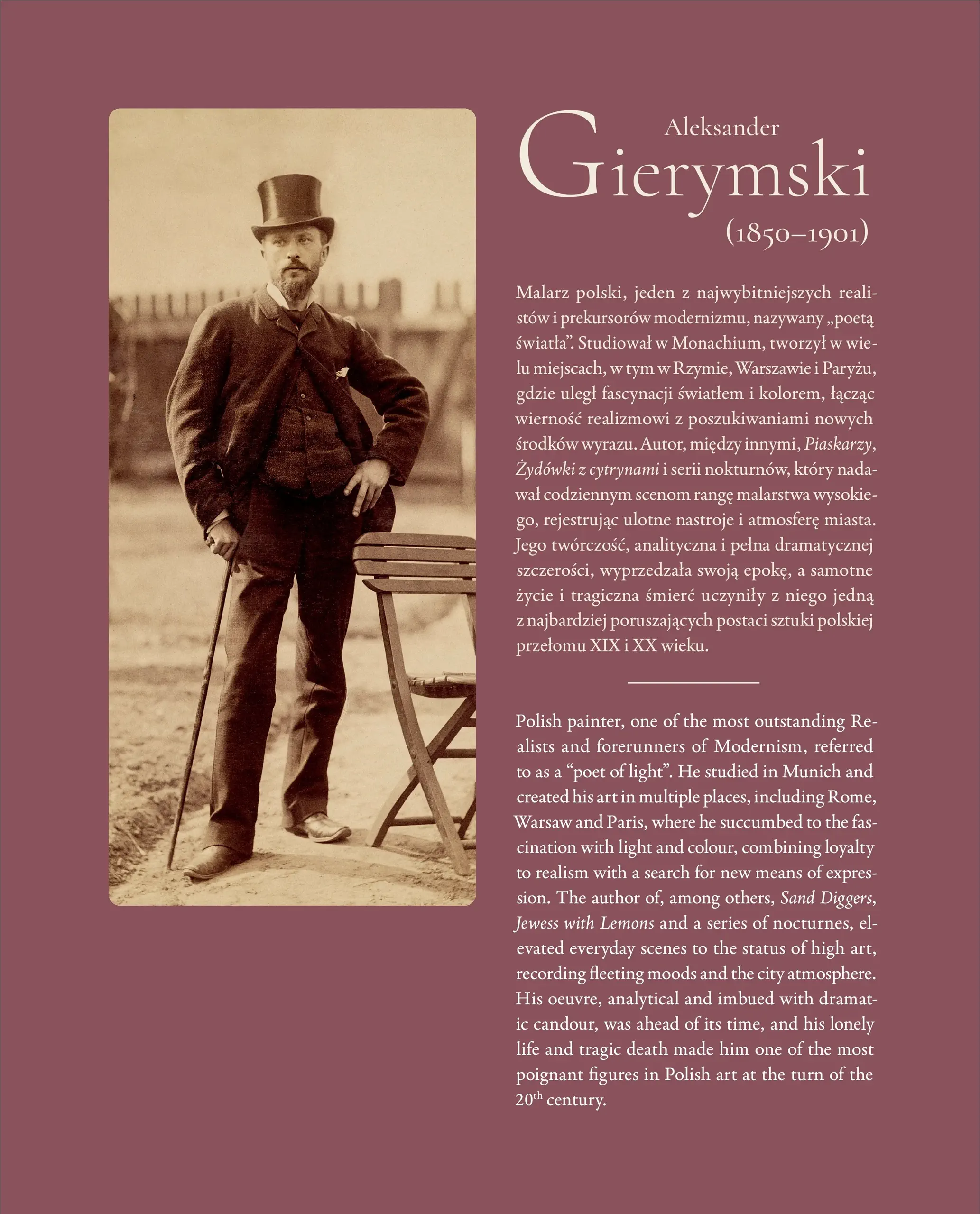 „Aleksander Gierymski” wyjątkowy album poświęcony malarskiej twórczości, wybitnego artysty epoki realizmu i wczesnego impresjonizmu, artysty, którego prace wyprzedzały swój czas. Gierymski, choć związany z nurtem realizmu, rozwinął indywidualny styl, wyróżniający się subtelnym podejściem do koloru i światła. Malował zarówno pejzaże, jak i sceny rodzajowe, często o tematyce miejskiej. Najpiękniejsze i najbardziej znane obrazy, takie jak Żydówka z pomarańczami czy Trumna chłopska, na nowo ożywają na kartach tego wyjątkowego albumu. Warstwę ilustracyjną wzbogaca historyczno-monograficzny tekst nt. życia i twórczości Gierymskiego autorstwa dr Stefanii Krzysztofowicz-Kozakowskiej. To nie tylko album – to podróż przez życie i epokę Gierymskiego, pełną pasji, samotności i artystycznego geniuszu. Idealny dla miłośników sztuki, kolekcjonerów oraz wszystkich, którzy pragną na nowo odkryć piękno polskiego malarstwa.