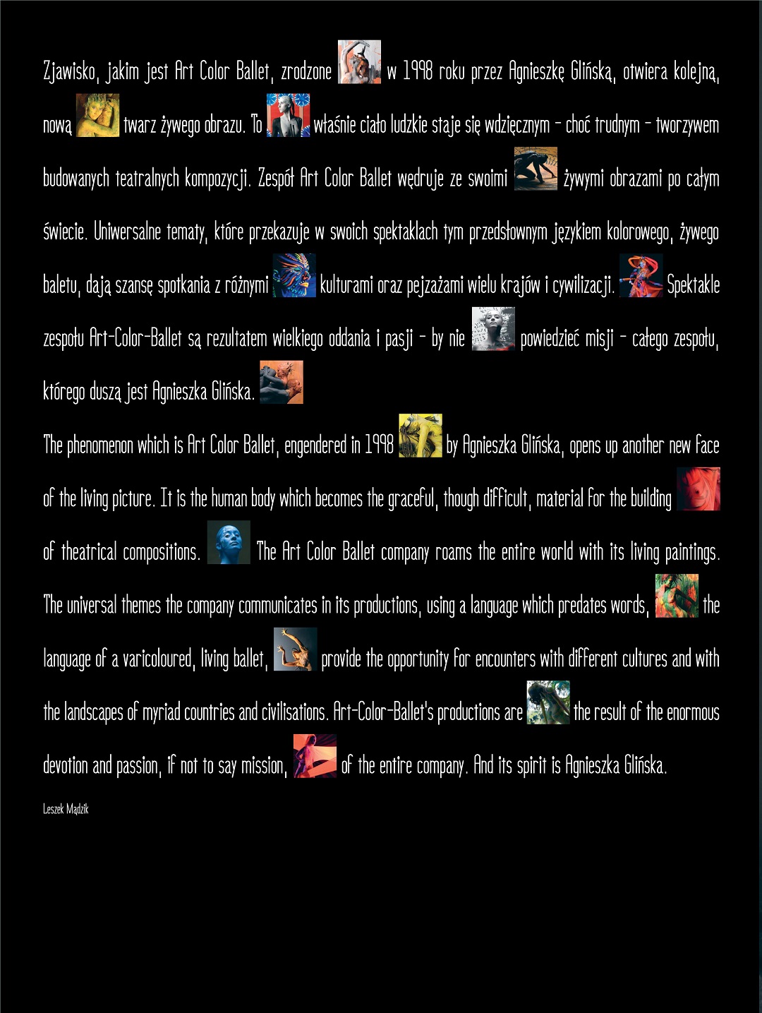Album przedstawia grupę krakowską Art Color Ballet, założoną przez Agnieszkę Glińską. Zespół uprawia nowoczesną formę baletu, w której jedną z integralnych i istotnych ról grają oryginalnie malowane, półnagie ciała tancerzy. Fotografie i uzupełniające je krótkie teksty twórców zdradzają tajniki warsztatu body paintingu oraz pokazują spektakle teatralne grupy zarówno od zaplecza, jak i na scenie, wprowadzając odbiorcę w niesamowity świat sztuki sięgającej do archetypów ludzkiej cywilizacji.