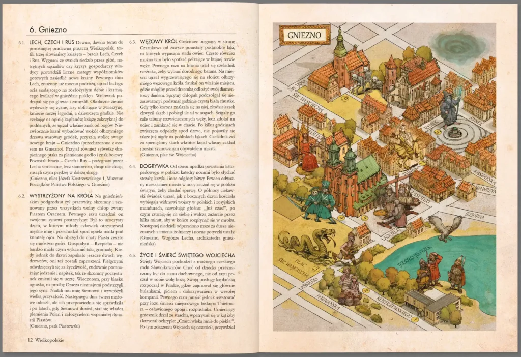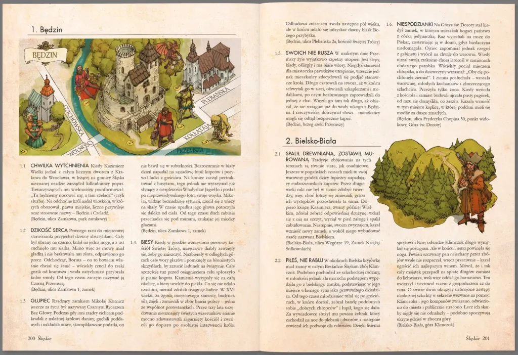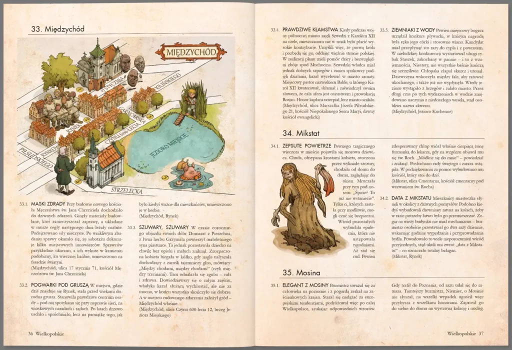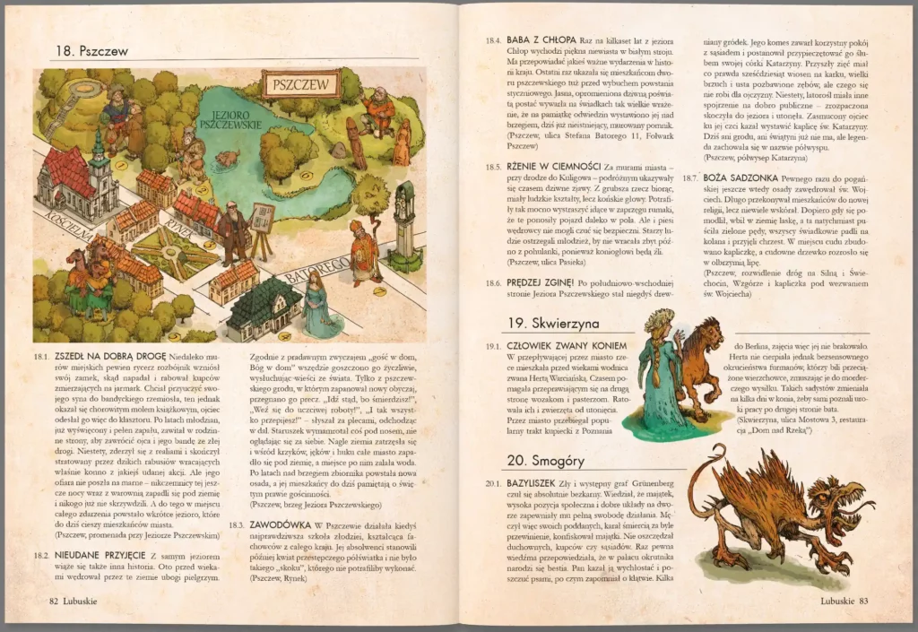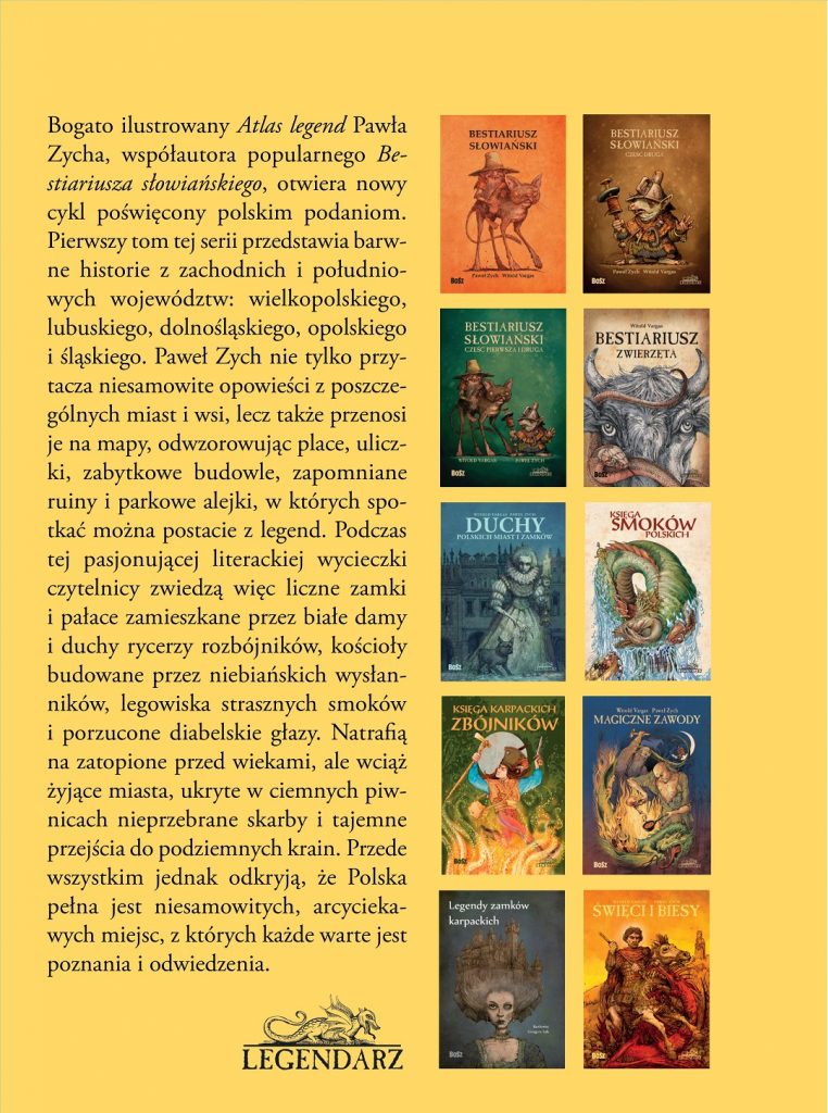 Bogato ilustrowana książka „Atlas legend” Pawła Zycha, autora popularnych „Bestiariuszy słowiańskich”, rozpoczyna nowy cykl poświęcony polskim podaniom. Podzielona na pięć części, przedstawia barwne historie z województw: śląskiego, opolskiego, dolnośląskiego, lubuskiego i wielkopolskiego. Autor nie tylko przytacza opowieści z poszczególnych miast i wiosek, lecz przenosi je także na mapy, odwzorowując opisywane postaci, miejskie uliczki i zabytki architektoniczne. Dzięki lekturze można się między innymi dowiedzieć, w którym mieście grasował afrozbójnik, skąd się wzięła nazwa Ząbkowice, gdzie kąsał prawampir, czym zaowocowało spotkanie Władysława Łokietka z drwalami w Puszczy Noteckiej oraz którędy przechodzi wrocławska upiorna procesja. To wspaniała pozycja, która w zabawny i przystępny sposób pozwoli starszym i młodszym czytelnikom na lepsze poznanie polskich miejscowości i legend.