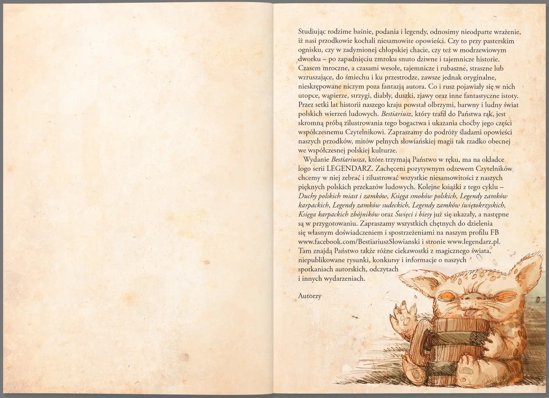 Studiując rodzime baśnie, podania i legendy, odnosimy nieodparte wrażenie, iż nasi przodkowie kochali niesamowite opowieści. Przez setki lat historii naszego kraju powstał olbrzymi, barwny i ludny świat polskich wierzeń ludowych. Pięknie ilustrowany przez Pawła Zycha i Witolda Vargasa „Bestiariusz” jest skromną próbą zilustrowania tego bogactwa i ukazania choćby jego części współczesnemu Czytelnikowi. Zapraszamy do podróży śladami opowieści naszych przodków, mitów pełnych słowiańskiej magii tak rzadko obecnej we współczesnej polskiej kulturze.