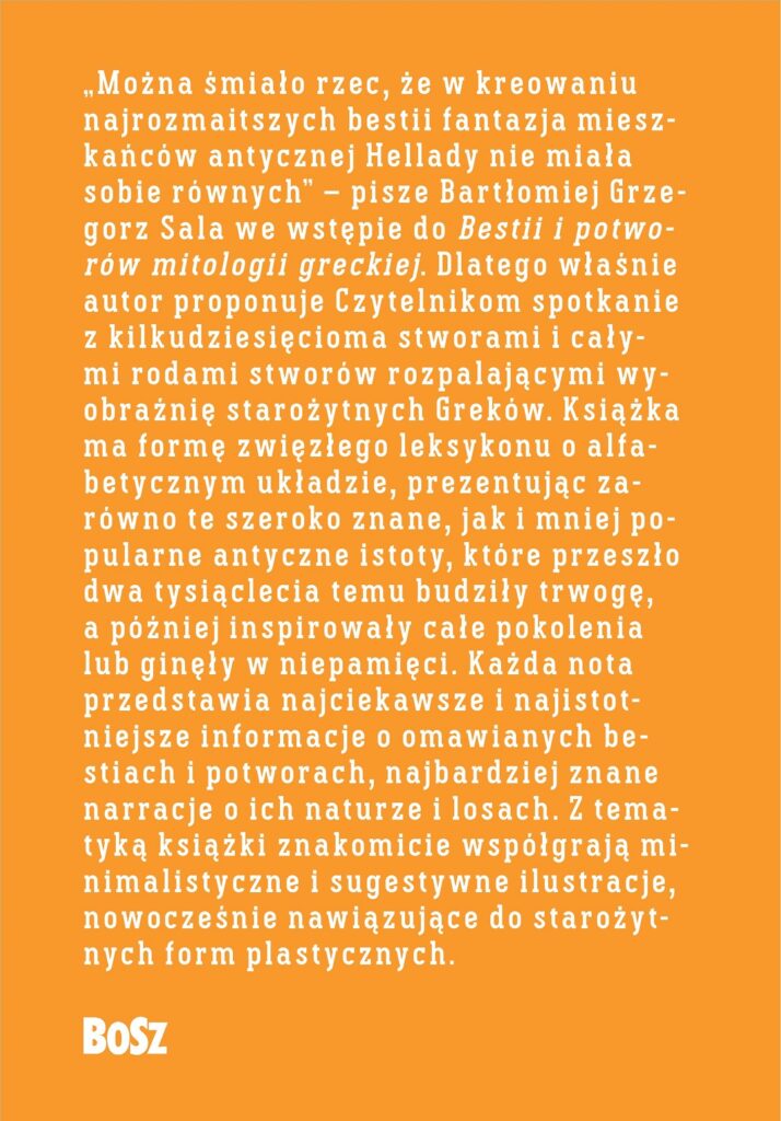 Mitologia grecka. Leksykon bestii i potworów – autorstwa Bartłomieja Grzegorza Sali przedstawia ponad siedemdziesiąt mitologicznych postaci ze starożytnych wierzeń greckich. Wszystkie opisane stwory charakteryzują się zadziwiającym wyglądem i umiejętnościami, świadczącymi o niezwykłej wyobraźni, jaką obdarzeni byli twórcy greckiej mitologii. Autor zaprezentował je w przyjazny czytelnikowi, zwięzły i przejrzysty sposób, czyniąc niniejszą książkę atrakcyjną pozycją dla każdego miłośnika niesamowitych, fantastycznych historii.