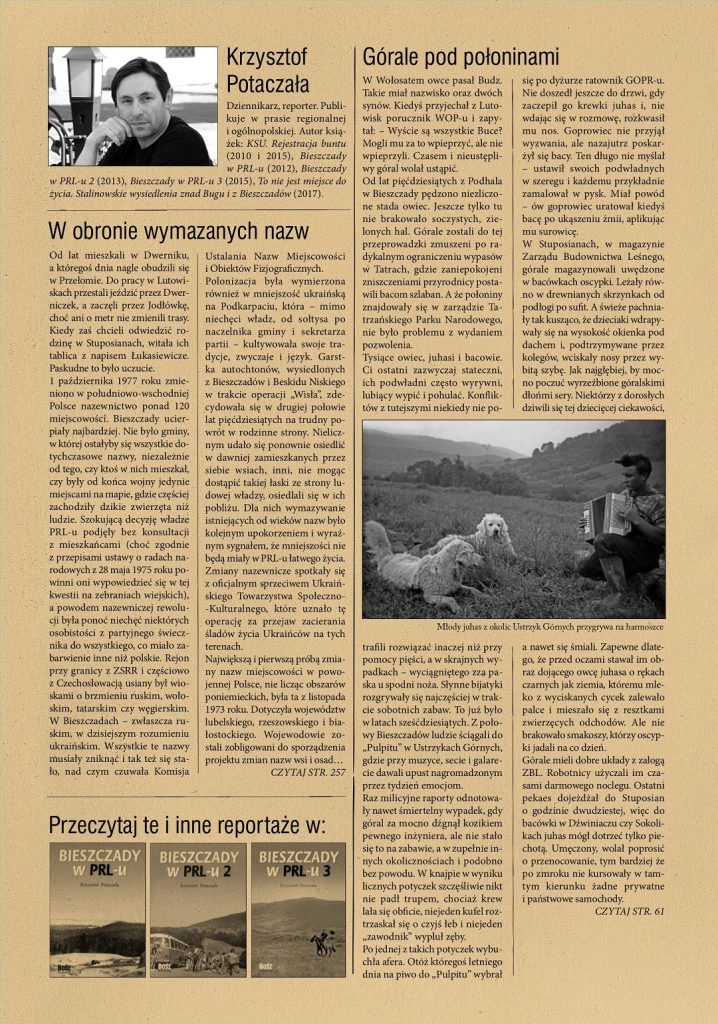 Bieszczady w PRL-u. Wybrane reportaże to zbiór najciekawszych reportaży pochodzących ze wszystkich trzech części popularnej serii autorstwa Krzysztofa Potaczały. Niezwykle interesujące historie przedstawiane przez autora zabierają czytelnika w świat bieszczadzkiej codzienności wśród niejednokrotnie trudnych komunistycznych realiów PRL-u. Autor, korzystając z mało znanych dotychczas źródeł, archiwalnych zdjęć, dokumentów, a także rozmów przeprowadzonych z mieszkańcami Bieszczadów, w tym także działaczami partyjnymi, tworzy intrygujący obraz czasów tamtych czasów. Książka zawiera również część niepublikowanych dotąd fotografii.