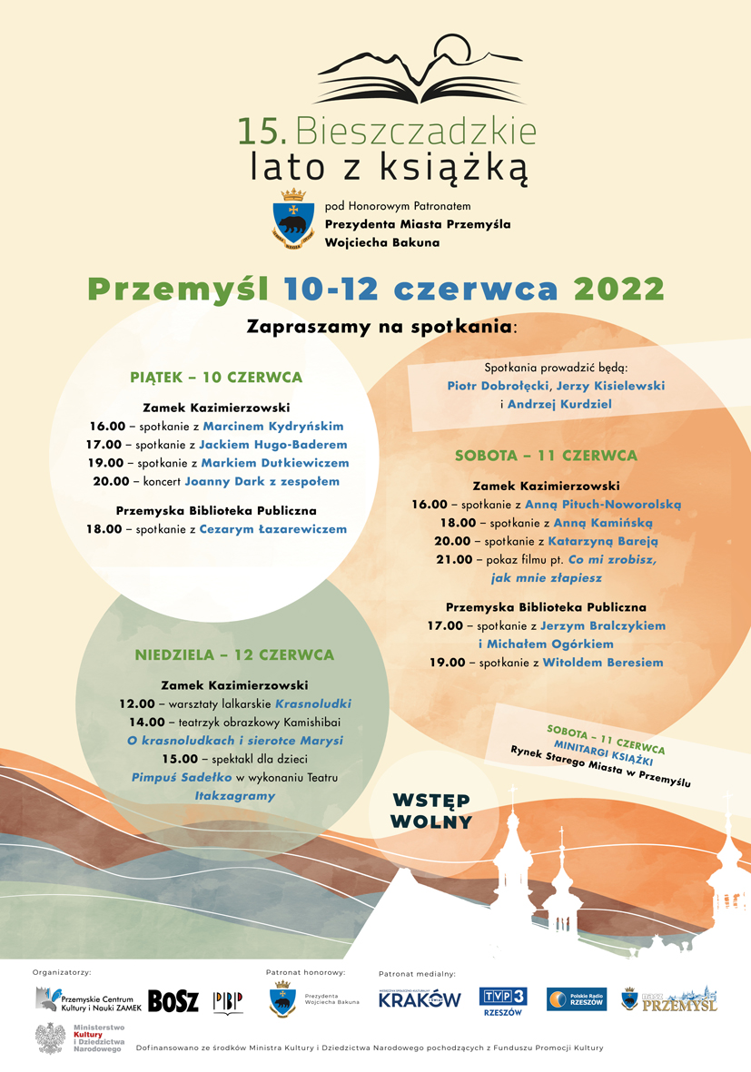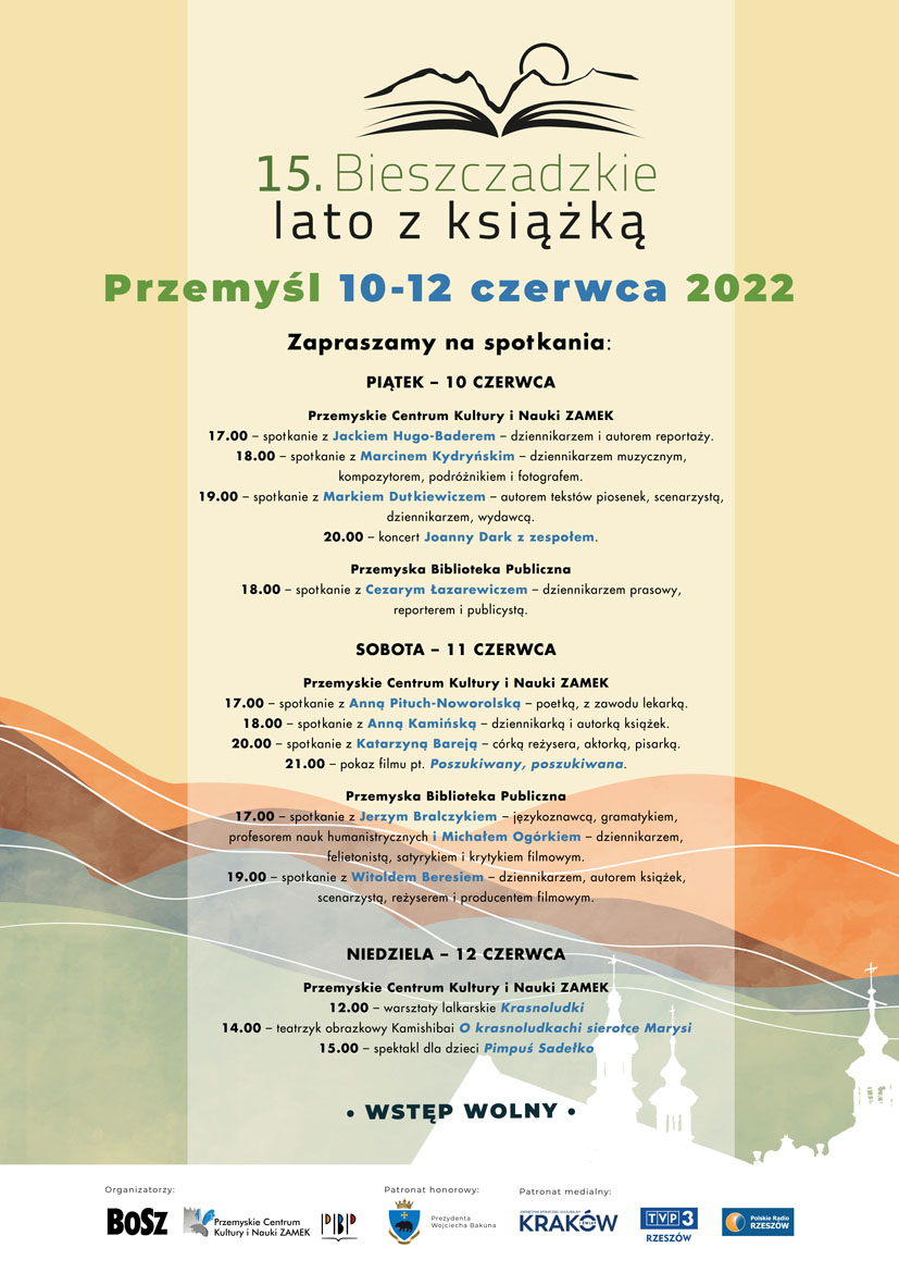 Wydawnictwo BOSZ, Przemyskie Centrum Kultury i Nauki ZAMEK oraz Przemyska Biblioteka Publiczna zapraszają na 15. edycję Bieszczadzkiego Lata z Książką.