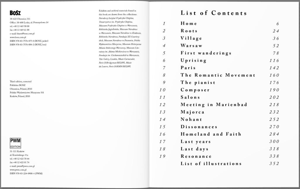 Wyjątkowy album przygotowywany na Rok Chopinowski. Teksty wybitnego muzykologa, chopinologa prof. Mieczysława Tomaszewskiego wprowadzają czytelnika w tajniki biografii i twórczości najwybitniejszego polskiego kompozytora. Bogactwo zdjęć i reprodukcji – zarówno archiwalnych jak i współczesnych pozwala przenieść się wyobraźnią w świat, w którym żył ten genialny artysta.