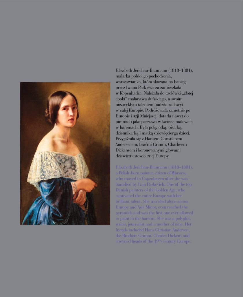 Książka autorstwa Jerzego Miśkowiaka i projektu Lecha Majewskiego przedstawia życie i twórczość Elisabeth Jerichau-Baumann, XIX-wiecznej artystki polskiego pochodzenia, która większość życia spędziła w Danii. Jerichau-Baumann portretowała najważniejsze duńskie osobistości – członków rodziny królewskiej, arystokratów, polityków, aktorów i pisarzy, m.in. Hansa Christiana Andersena, ale także dzieci i żebraków. Malarka chętnie posługiwała się alegoriami – jest autorką niezwykle popularnego przedstawienia Danii jako Walkirii niosącej duńską flagę i miecz, której wizerunek był wykorzystywany m.in. na pudełkach czekoladek czy pocztówkach. Na płótnach artystki wielokrotnie pojawiały się również Turczynki, Egipcjanki, Żydówki i Włoszki, a zwłaszcza bohaterki sag i baśni – Halgjerde, Lorelei, nimfy i liczne syrenki, powstałe zapewne z inspiracji warszawskim herbem. Album, zawierający biografię artystki i polskie konteksty jej twórczości, przybliża na niemal 300 reprodukcjach styl malarki i czasy, w których żyła.
