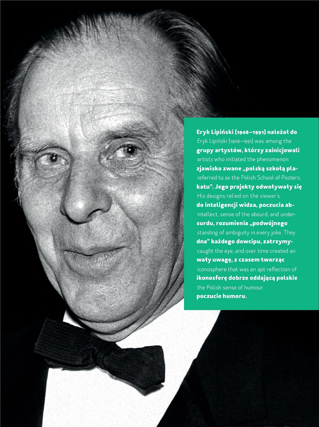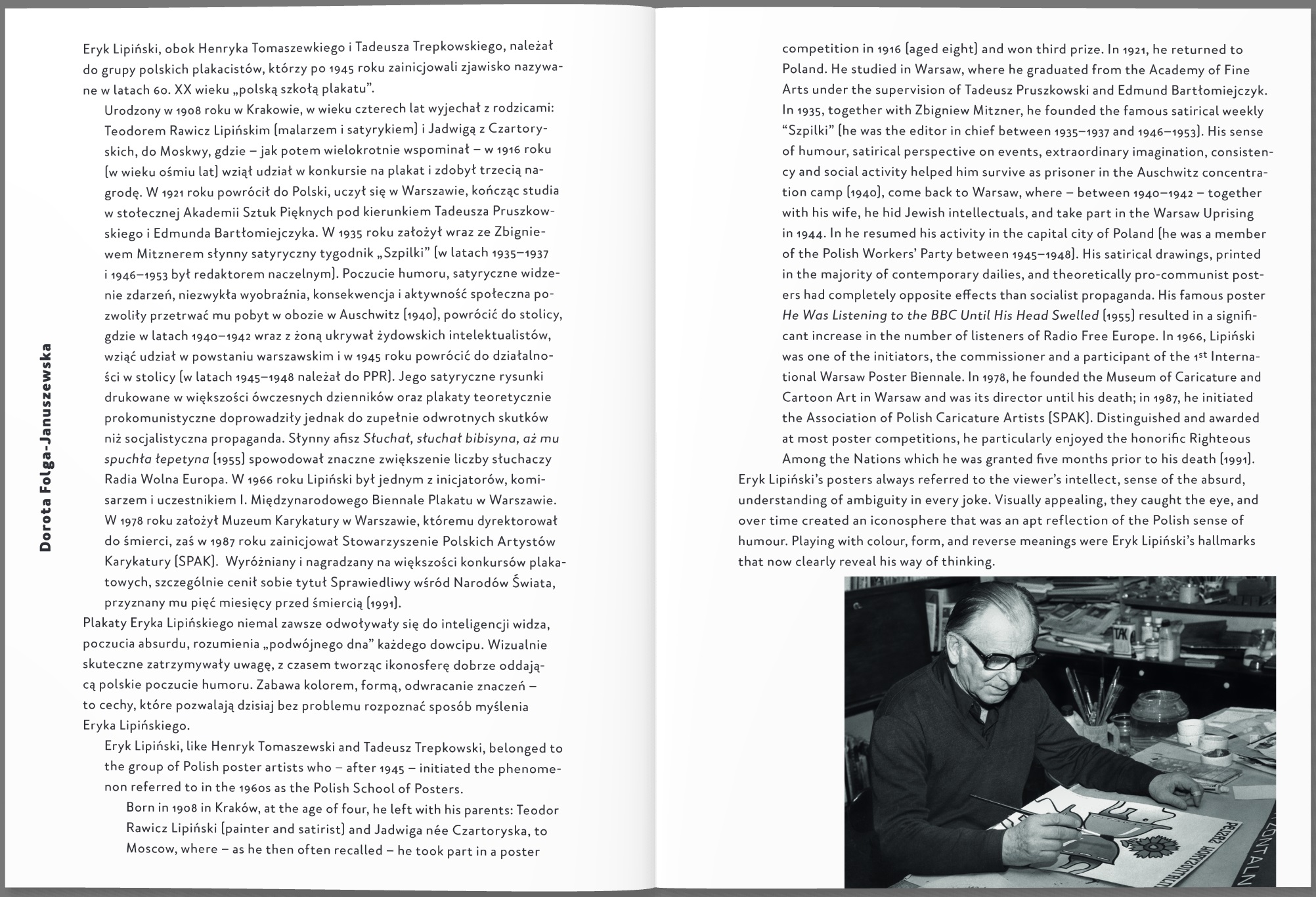 Książka prezentująca dorobek Eryka Lipińskiego (1908–1991) – rysownika, autora plakatów, ilustracji książkowych, karykaturzysty i satyryka – powstała we współpracy z Muzeum Karykatury w Warszawie, którego artysta był inicjatorem. W 1935 roku wraz ze Zbigniewem Mitznerem i Zenonem Wasilewskim założył czasopismo „Szpilki”, w którym przez kilka lat pełnił funkcję redaktora naczelnego. Jako rysownik współpracował ponadto m.in. z „Przekrojem”, „Przeglądem Kulturalnym”, „Trybuną Ludu”, „Panoramą” oraz „Expressem Wieczornym”. W twórczości plakatowej Lipińskiego istotną rolę odegrała groteska, a dzięki dużej różnorodności techniki i formy jego prace zyskały swój własny niepowtarzalny charakter.