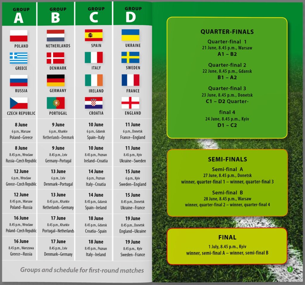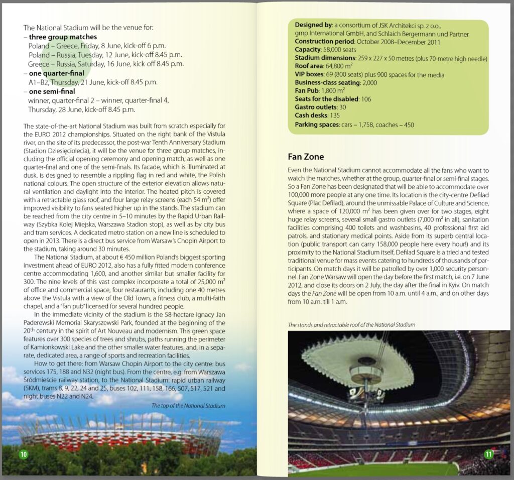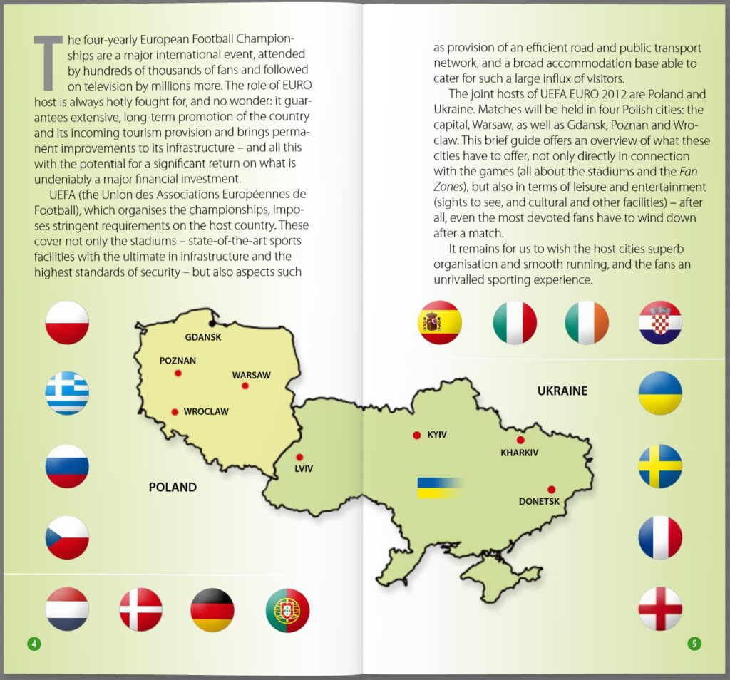 Jest tu oczywiście „niezbędnik kibica”, prezentowane są również wszystkie polskie stadiony przygotowane na Euro 2012. Ale książka przynosi konkretne propozycje dla przyjezdnych także w przerwach pomiędzy kolejnymi meczami. Kiedy i gdzie skorzystać z lokalnych rozrywek? Które atrakcje konkretnego miasta gospodarza mistrzostw zobaczyć? A może zwiedzić najbliższą okolicę?