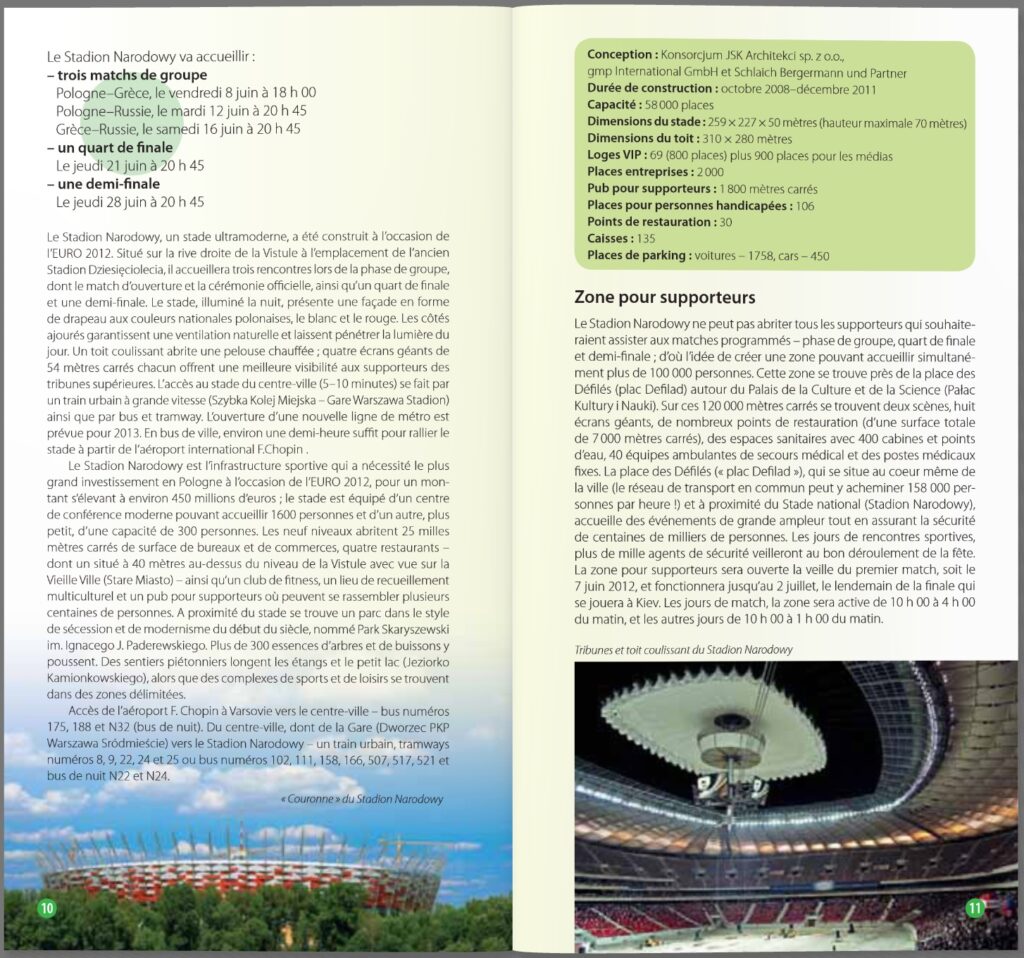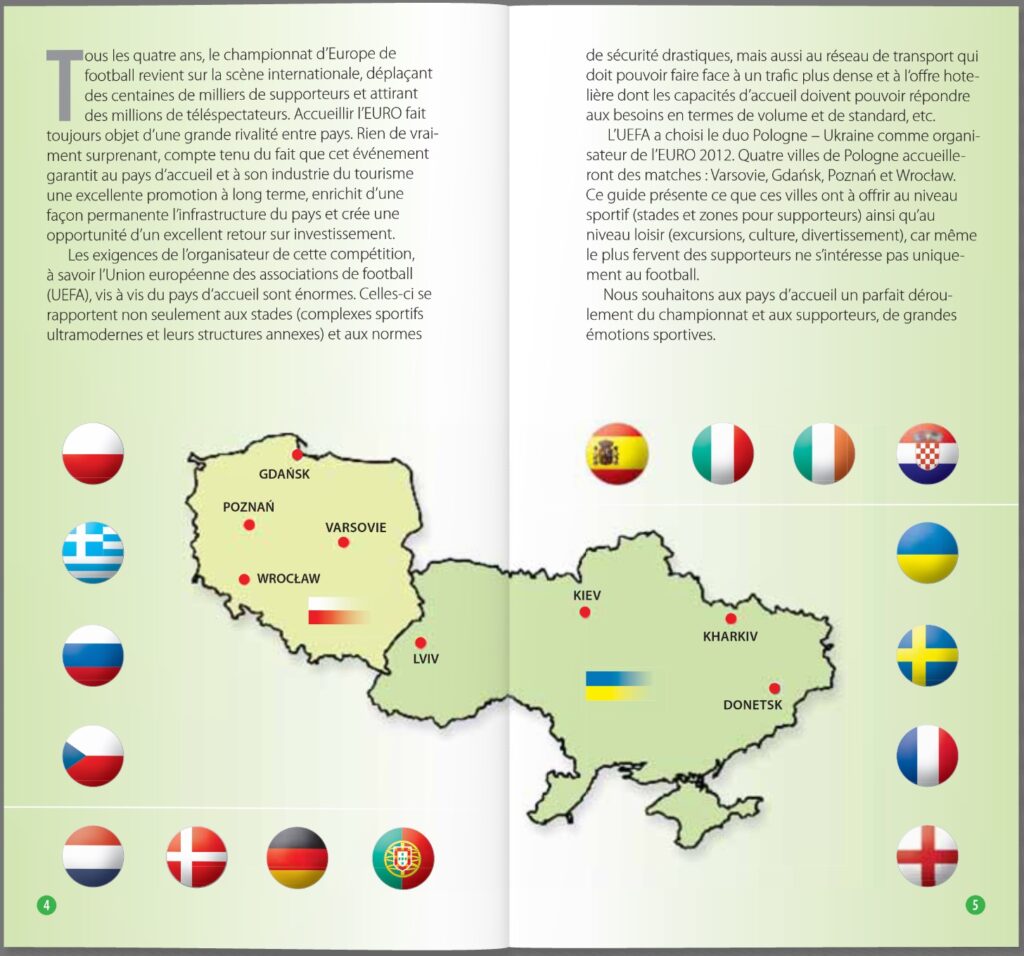 Jest tu oczywiście 'niezbędnik kibica’, prezentowane są również wszystkie polskie stadiony przygotowane na Euro 2012. Ale książka przynosi konkretne propozycje dla przyjezdnych także w przerwach pomiędzy kolejnymi meczami. Kiedy i gdzie skorzystać z lokalnych rozrywek? Które atrakcje konkretnego miasta gospodarza mistrzostw zobaczyć? A może zwiedzić najbliższą okolicę?