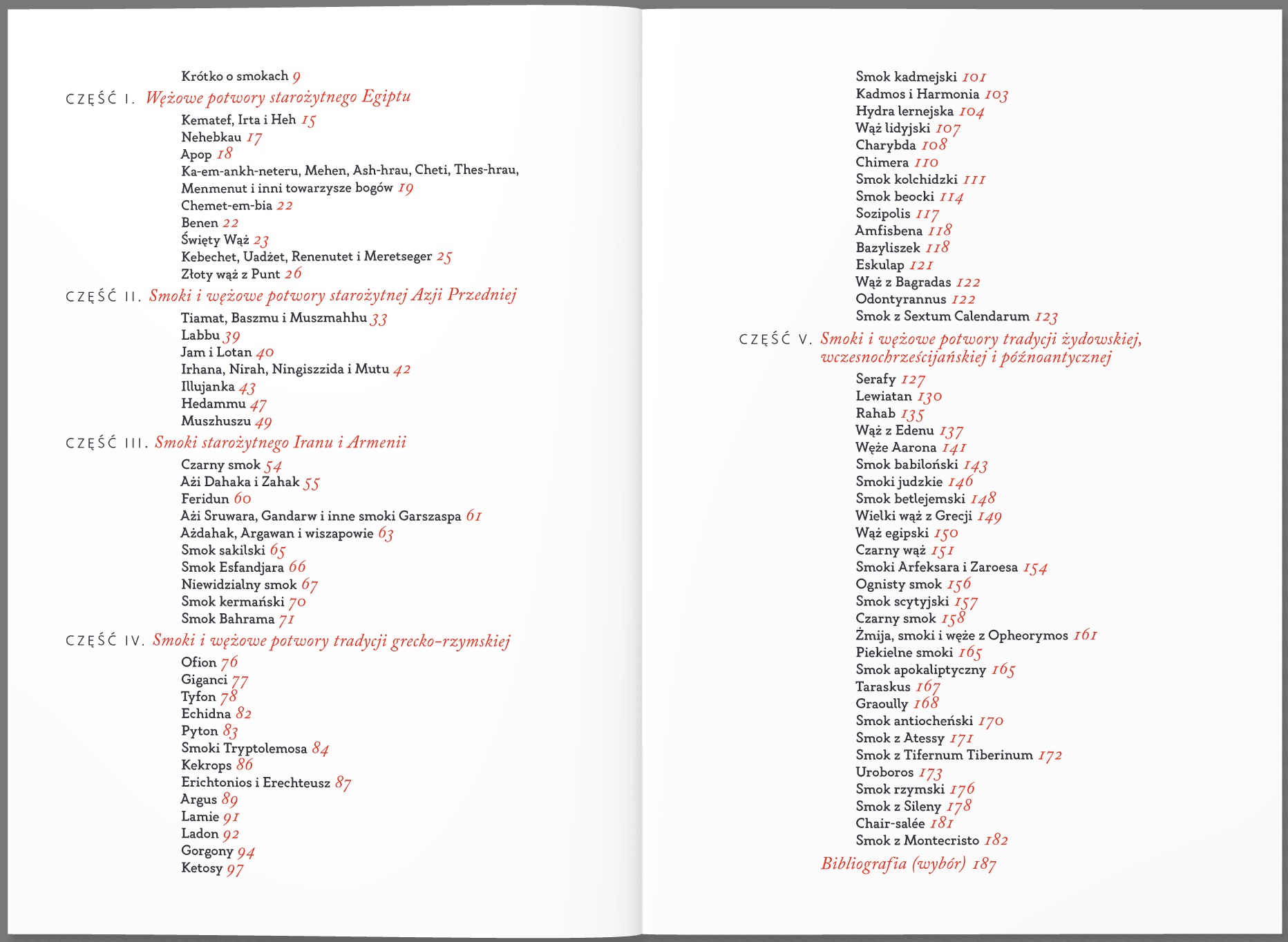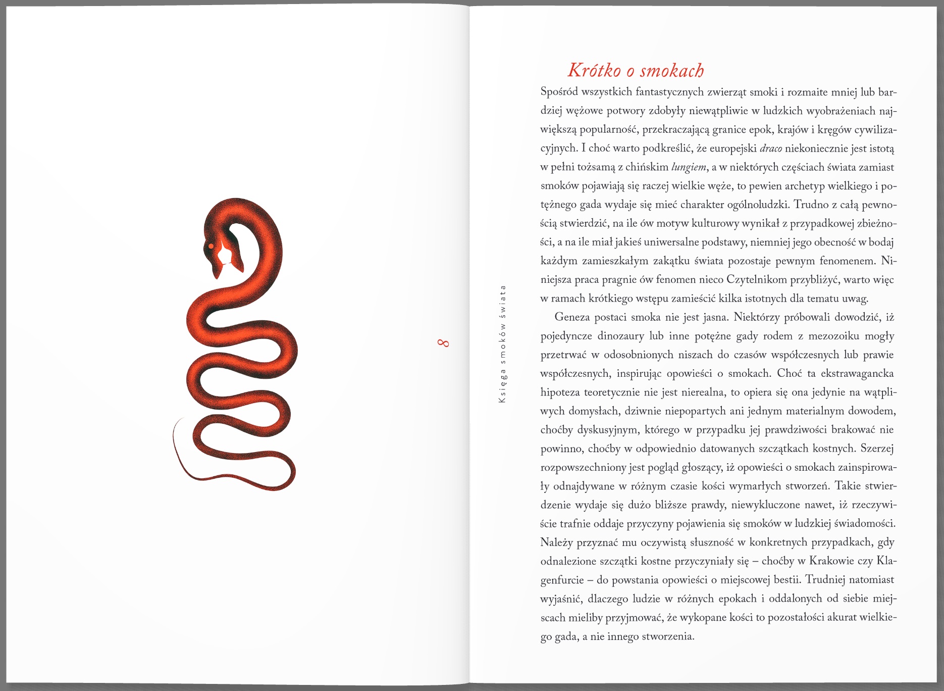 Pierwszy z trzech tomów „Księgi smoków świata” przybliża portrety i losy ponad setki smoków i pokrewnych im wężowych potworów należących do świata starożytnych cywilizacji basenu Morza Śródziemnego oraz Bliskiego i Środkowego Wschodu. W publikacji opisane zostały straszliwe gady znane z wyobrażeń Egipcjan, ludów Mezopotamii, Anatolii, Syro-Palestyny, Iranu i Armenii, świata Greków i Rzymian, tradycji biblijnej i apokryficznej aż po późny antyk chrześcijański.