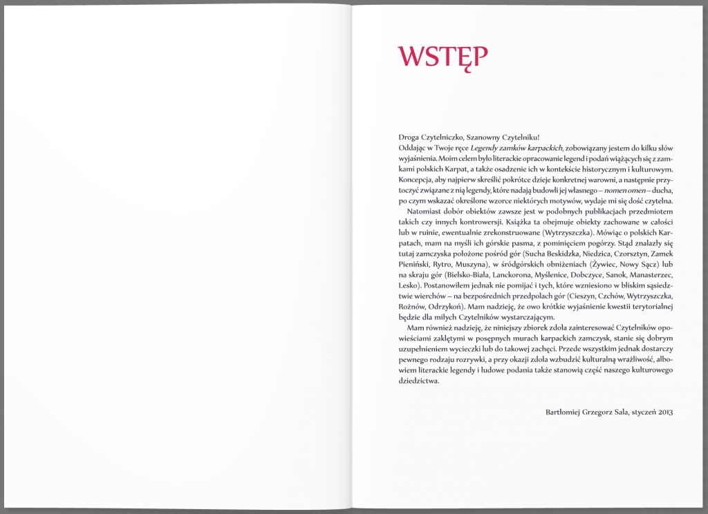 „Legendy zamków karpackich” to zbiór 65 podań, baśni i ludowych opowieści, na nowo opracowanych piórem Bartłomieja Grzegorza Sali. Związane są one z zamczyskami polskich Karpat, wznoszącymi się od przedpola Beskidu Śląskiego po Bieszczady. Dotyczą warowni wyrosłych przed wiekami w głębi gór, w śródgórskich kotlinach lub w najbliższej okolicy karpackich wierchów; obiektów do dziś zachowujących swój blask, jak i pozostających w ruinie. Na kartach książki na nowo ożywają duchy i zjawy, święci i diabły, okrutni panowie i dzielni junacy, namiętni kochankowie i bezwzględni zbójcy.