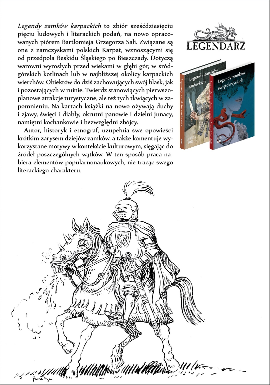„Legendy zamków karpackich” to zbiór 65 podań, baśni i ludowych opowieści, na nowo opracowanych piórem Bartłomieja Grzegorza Sali. Związane są one z zamczyskami polskich Karpat, wznoszącymi się od przedpola Beskidu Śląskiego po Bieszczady. Dotyczą warowni wyrosłych przed wiekami w głębi gór, w śródgórskich kotlinach lub w najbliższej okolicy karpackich wierchów; obiektów do dziś zachowujących swój blask, jak i pozostających w ruinie. Na kartach książki na nowo ożywają duchy i zjawy, święci i diabły, okrutni panowie i dzielni junacy, namiętni kochankowie i bezwzględni zbójcy.