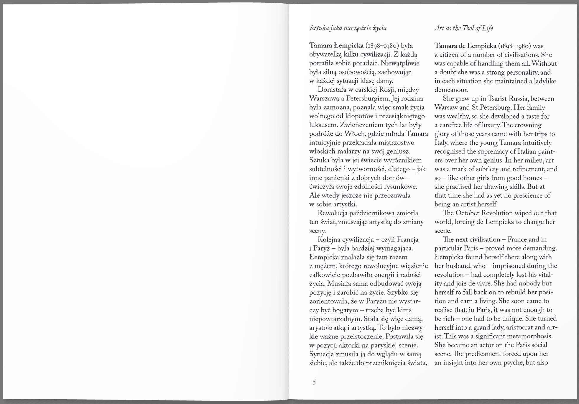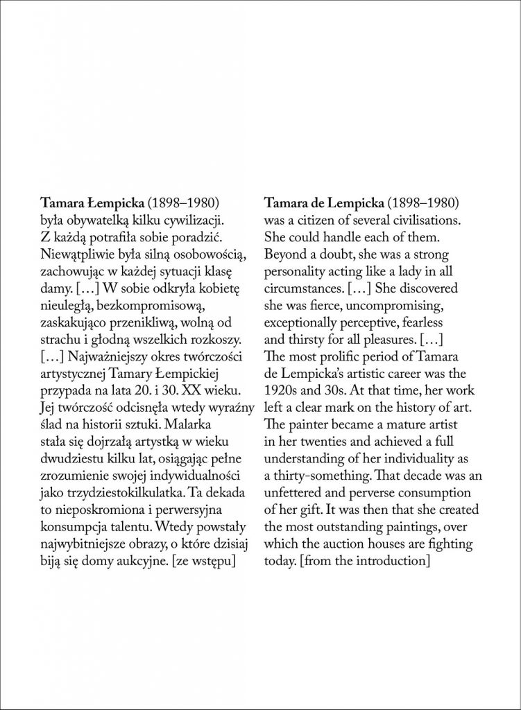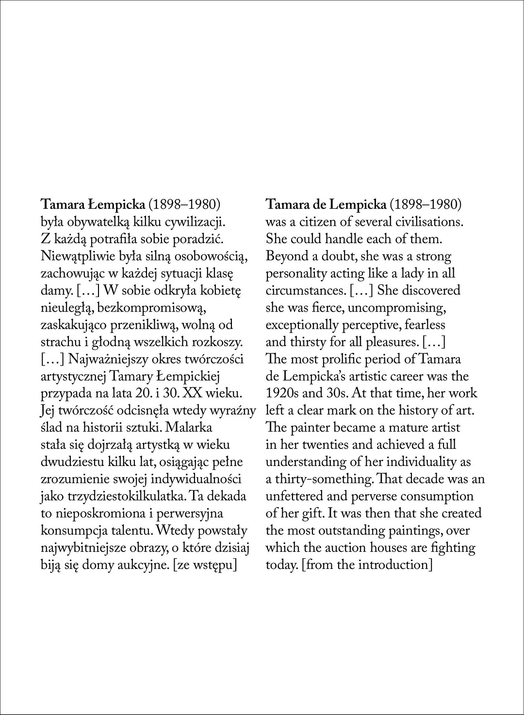 Tamara Łempicka (1898–1980) to najbardziej znana polska artystka na świecie. Jej obrazy należą do najchętniej kupowanych i osiągają zawrotne ceny na aukcjach. Królowa art déco pochodziła z zamożnej, wpływowej rodziny. Od najmłodszych lat interesowała się sztuką, z którą często obcowała. Elegancka, błyskotliwa skandalistka w Paryżu zrobiła furorę swymi portretami o świetlistych, żywych kolorach z wyraźnymi cieniami i w niestandardowej stylizacji. Z tego okresu pochodzą Autoportret w zielonym bugatti, Portret Iry P. oraz akty Andromeda i Kobieta z gołębiem. Po wyjeździe do Stanów Zjednoczonych malowała głównie portrety gwiazd Hollywood, słynąc przy tym z bujnego i dekadenckiego stylu życia. Szczególne miejsce w twórczości Łempickiej zajmują akty. Doskonałym przykładem jest Piękna Rafaela, arcydzieło art déco, które oddaje zmysłowość modelki i akcentuje jej cielesność.