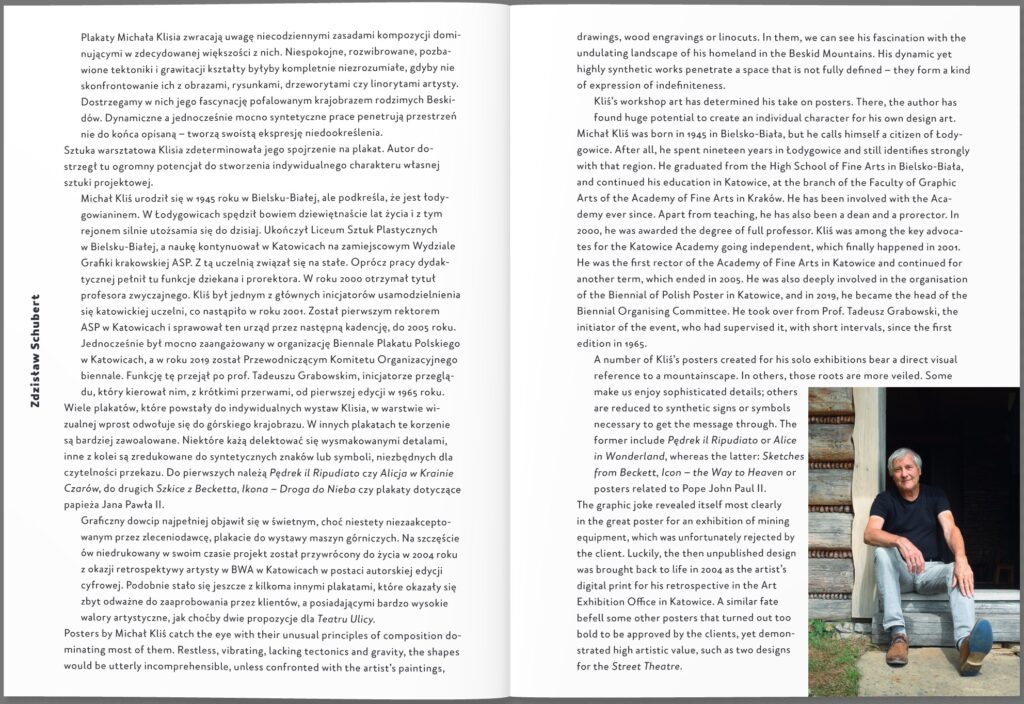 Dwudziesty pierwszy tomik w serii „Plakaty” poświęcony jest twórczości profesora Michała Klisia związanego z Akademią Sztuk Pięknych w Katowicach, której był rektorem w latach 2001–2005. Artysta zajmuje się malarstwem, plakatem i grafiką użytkową. Został uhonorowany wieloma prestiżowymi nagrodami w dziedzinie plakatu i sztuki użytkowej, m.in. Złotymi Medalami na Biennale Plakatu Polskiego w Katowicach (1987, 1999, 2001) czy Brązowym Medalem na Międzynarodowym Triennale Plakatu Teatralnego w Sofii (2001). Prace Klisia znajdują się w wielu zbiorach muzealnych i kolekcjach prywatnych, m.in. w Bielsku-Białej, Poznaniu, Wilanowie, Lahti, Watykanie, Nowym Jorku i Sydney. W jego twórczości widoczne są inspiracje pofalowanym krajobrazem Beskidów. Wstęp i wybór prac do minialbumu przygotował Zdzisław Schubert.