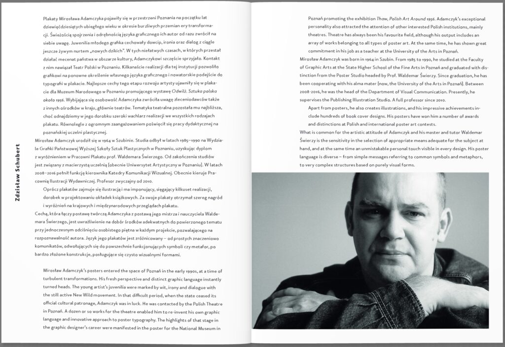 Książka „Adamczyk. Plakaty”, opatrzona słowem wstępnym Zdzisława Schuberta, przedstawia twórczość uznanego współczesnego plakacisty – Mirosława Adamczyka. Bohater kolejnego minialbumu w serii Plakaty to absolwent Wydziału Grafiki Państwowej Wyższej Szkoły Sztuk Plastycznych w Poznaniu, obecnie wykładowca Uniwersytetu Artystycznego w Poznaniu i kierownik Pracowni Ilustracji Wydawniczej. Adamczyk uczestniczy w wielu wystawach oraz konkursach, m.in. w Katowicach, Krakowie, Lahti, Hong Kongu, Ogakhi czy Nowym Jorku, jest laureatem licznych nagród i wyróżnień. Specjalizuje się w plakacie i ilustracji, zajmuje się również projektowaniem okładek książkowych. Twórczość artysty charakteryzują prostota formy i kontrastowe połączenia kolorystyczne.