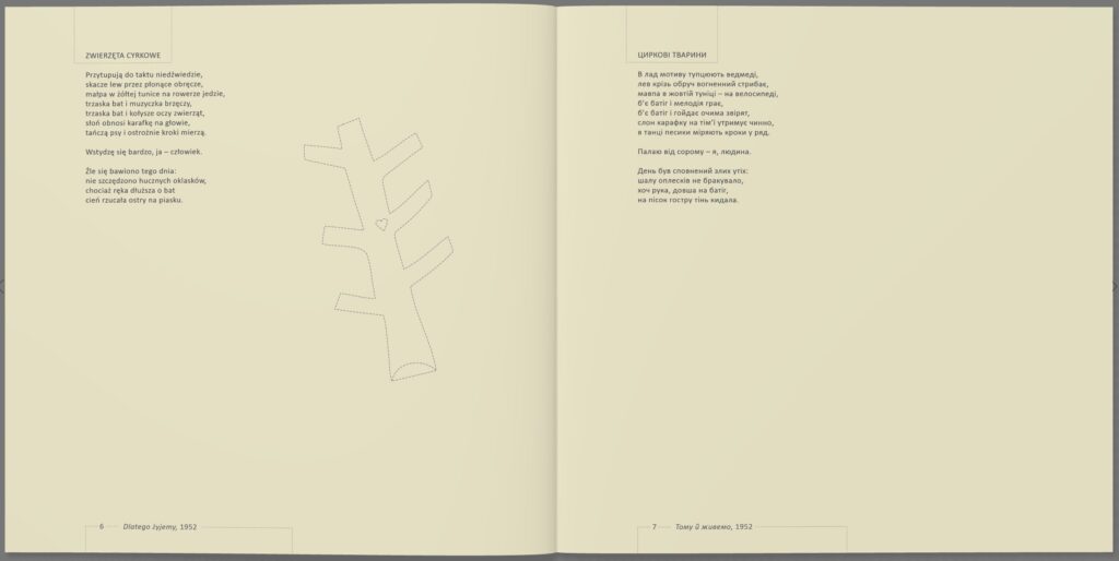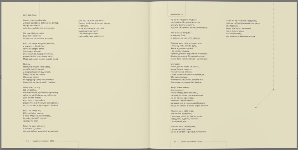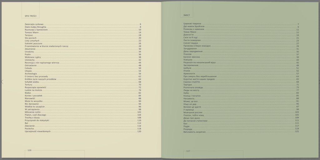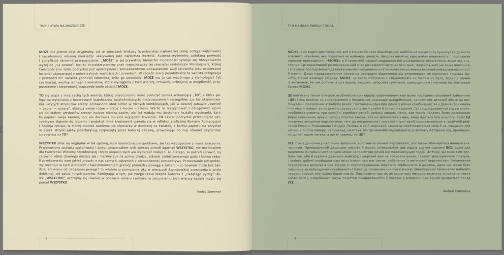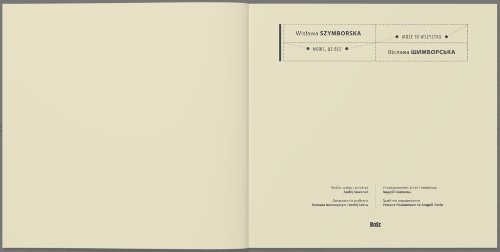 Zbiór czterdziestu wierszy Wisławy Szymborskiej, połączonych z tłumaczeniem tych utworów na język ukraiński, przygotowanym przez Andrija Savenetsa, który dokonał także wyboru tekstów. Oryginalny projekt graficzny oraz zainspirowane poezją Noblistki ilustracje są dziełem lwowskich projektantów – Romany Romanyszyn i Andrija Łesiwa. Po cieszących się wielką popularnością Zielnikach to kolejna publikacja, w interesujący sposób łącząca prace plastyczne i poezję Szymborskiej.