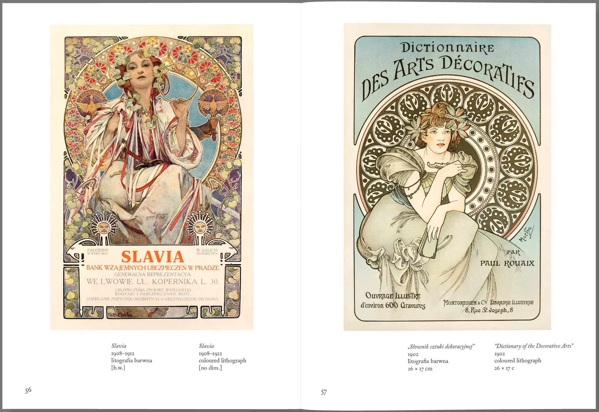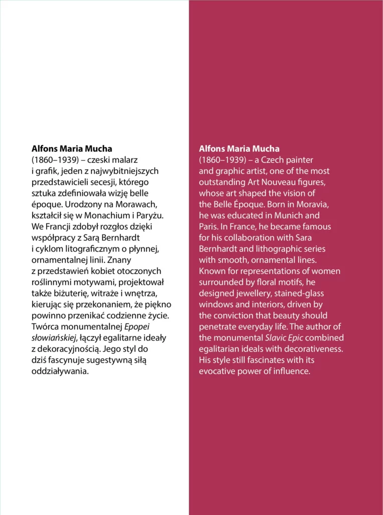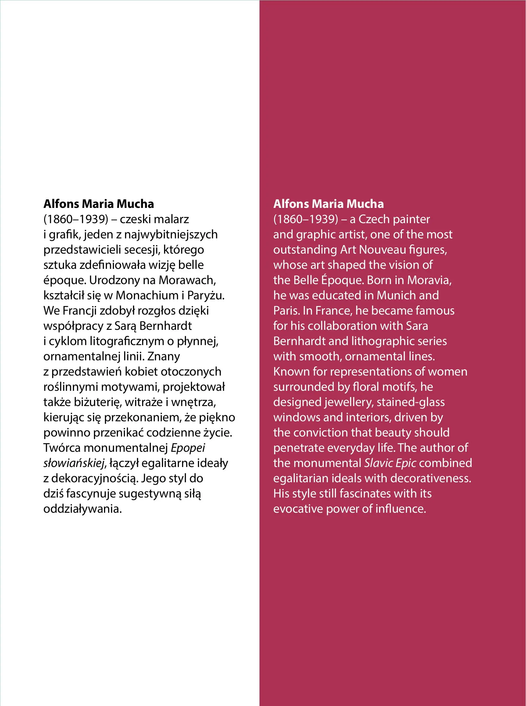 Alfons Mucha (1860–1939). Był czeskim malarzem, ilustratorem i grafikiem, uznawanym za jednego z najwybitniejszych przedstawicieli secesji. Mucha zdobył międzynarodową sławę dzięki swoim charakterystycznym plakatom, zwłaszcza tym tworzonym dla słynnej aktorki Sarah Bernhardt. Jego styl wyróżniał się ornamentalnością, delikatnymi liniami, pastelowymi kolorami i wizerunkami kobiet otoczonych roślinnymi motywami. Po latach spędzonych w Paryżu i innych miastach Europy, Mucha powrócił do ojczyzny, gdzie stworzył swoje największe dzieło – monumentalny cykl malarski „Epopeja słowiańska”, przedstawiający historię narodów słowiańskich. Album prezentuje blisko 60 dzieł tego artysty.