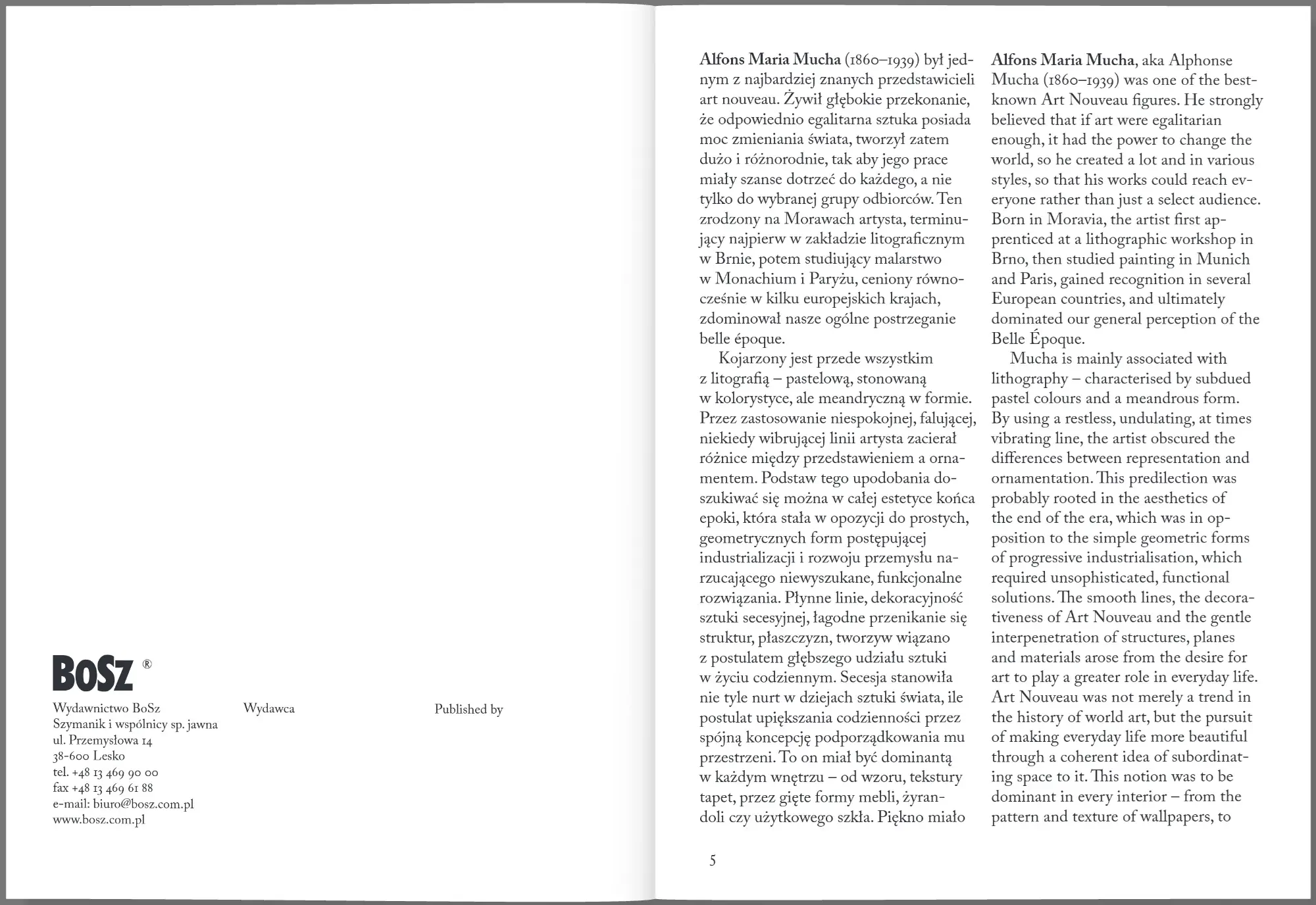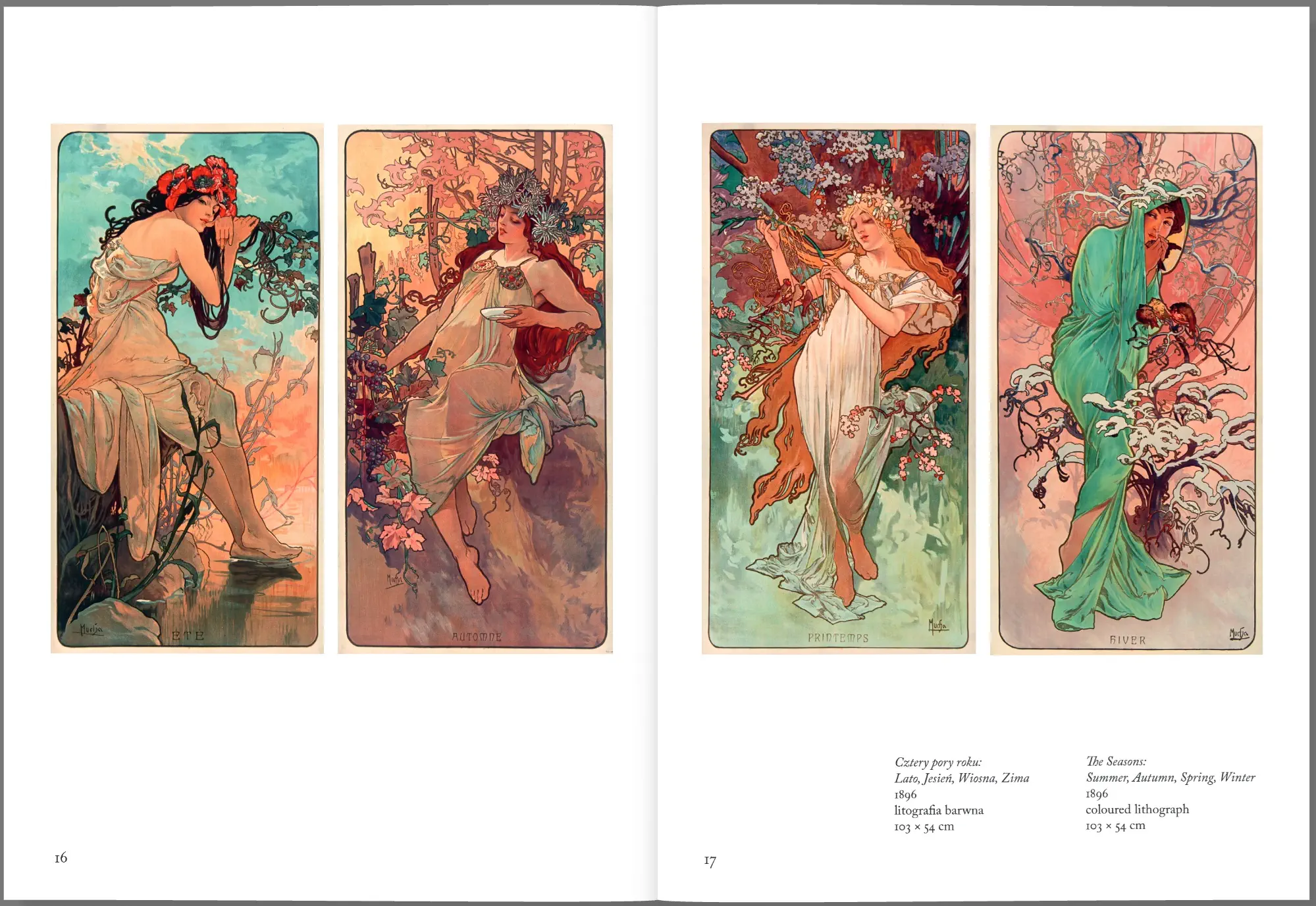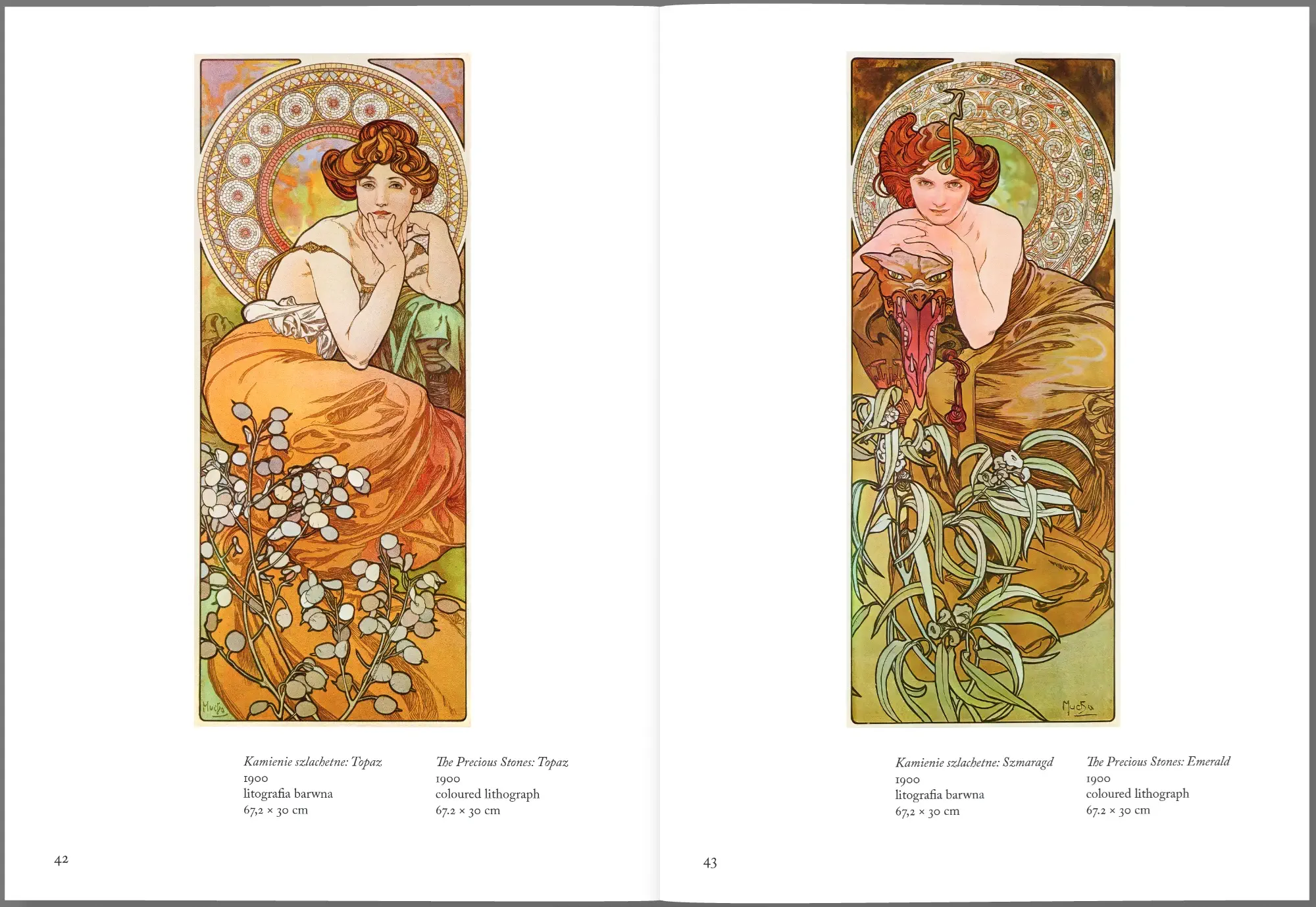 Alfons Mucha (1860–1939). Był czeskim malarzem, ilustratorem i grafikiem, uznawanym za jednego z najwybitniejszych przedstawicieli secesji. Mucha zdobył międzynarodową sławę dzięki swoim charakterystycznym plakatom, zwłaszcza tym tworzonym dla słynnej aktorki Sarah Bernhardt. Jego styl wyróżniał się ornamentalnością, delikatnymi liniami, pastelowymi kolorami i wizerunkami kobiet otoczonych roślinnymi motywami. Po latach spędzonych w Paryżu i innych miastach Europy, Mucha powrócił do ojczyzny, gdzie stworzył swoje największe dzieło – monumentalny cykl malarski „Epopeja słowiańska”, przedstawiający historię narodów słowiańskich. Album prezentuje blisko 60 dzieł tego artysty.