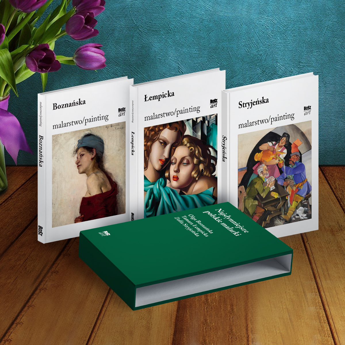 Zestaw trzech miniaturowych albumów w etui poświęconych wybitnym polskim malarkom – Oldze Boznańskiej, Tamarze Łempickiej i Zofii Stryjeńskiej.