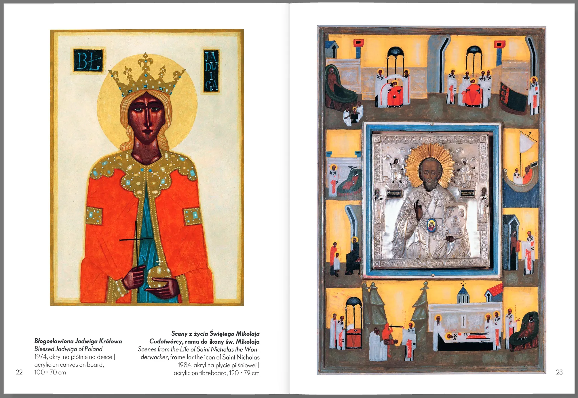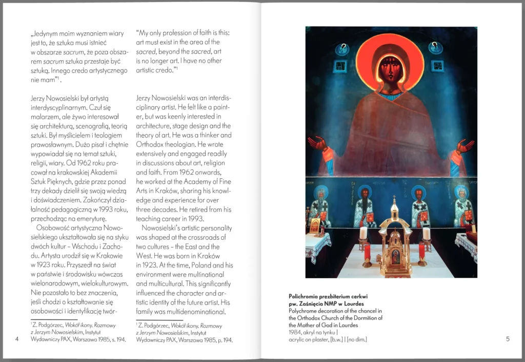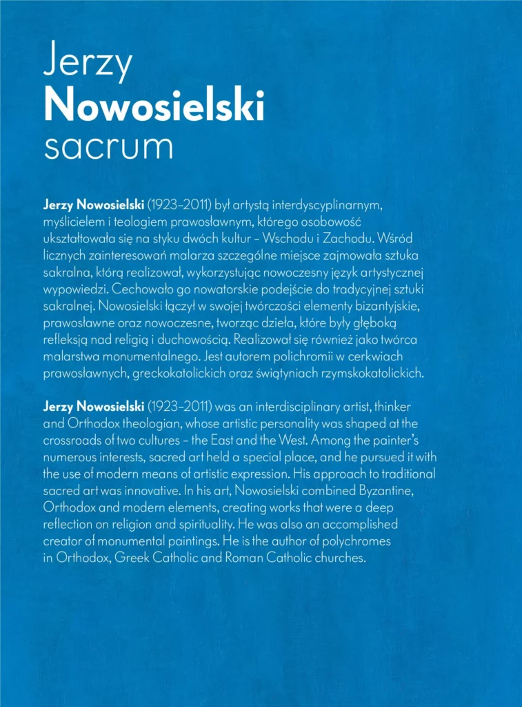 Minialbum prezentujący dzieła sakralne profesora Jerzego Nowosielskiego (1923–2011), wybitnej postaci w świecie sztuki. Nowosielski był znany ze swojego unikalnego podejścia do sztuki sakralnej, które polegało na harmonijnym łączeniu tradycji z nowoczesnością, głęboko zakorzenionego w duchowości. To podejście wynikało z jego rozległych zainteresowań filozoficzno-teologicznych. Minialbum przedstawia wybrane, imponujące polichromie monumentalne oraz pojedyncze ikony, stanowiące znaczną część jego artystycznego dorobku.