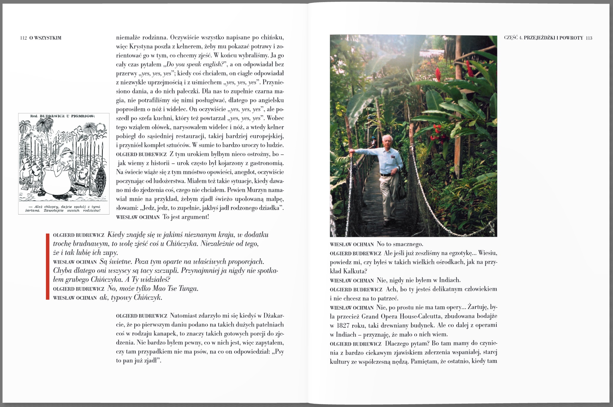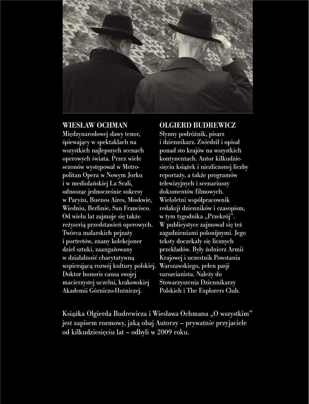 Książka Olgierda Budrewicza i Wiesława Ochmana 'O wszystkim’ jest zapisem 'rozmowy rzeki’. Z niezliczonych anegdot, wyjętych z bogatego doświadczenia zawodowego i życiowego wybitnego tenora operowego i słynnego podróżnika – tworzy się prywatna historia polskich i światowych wydarzeń kilku ostatnich dekad.