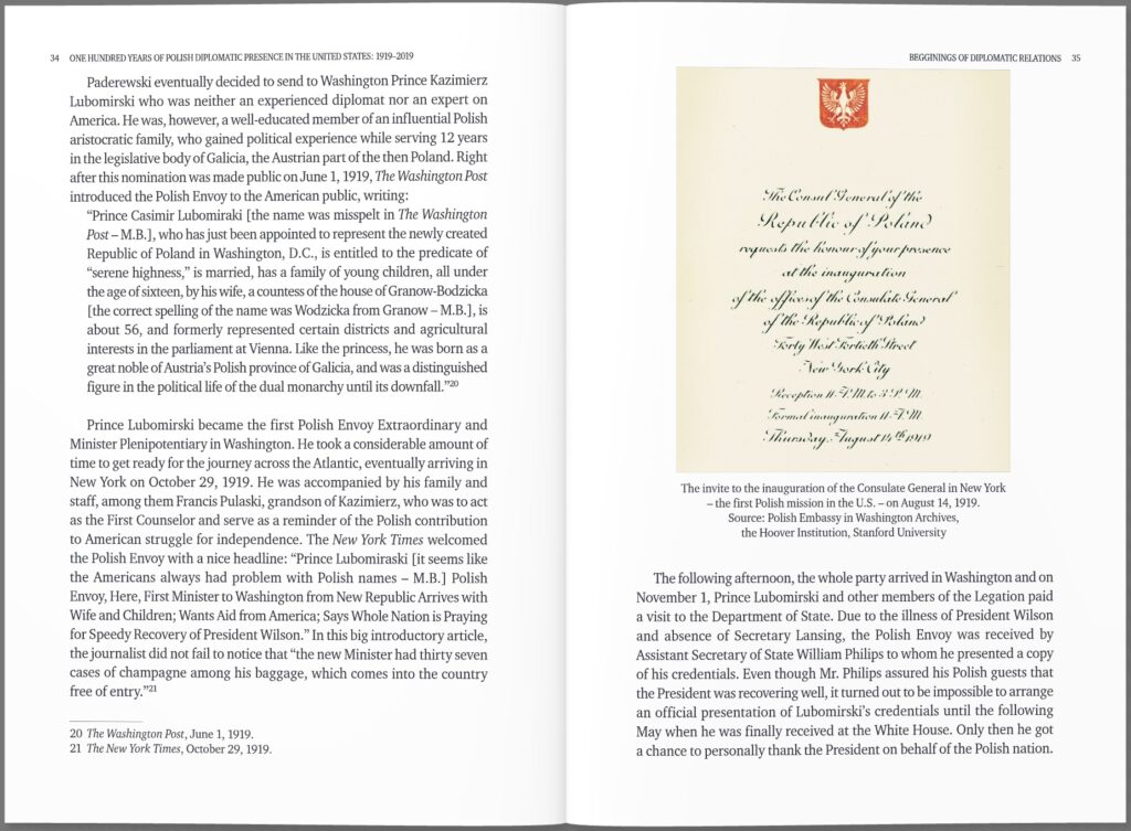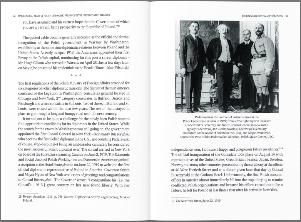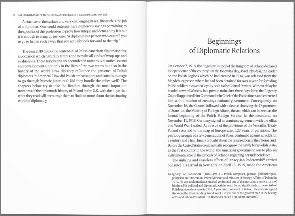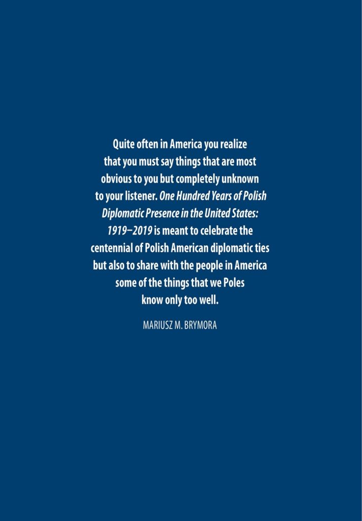 One Hundred Years of Polish Diplomatic Presence in the United States: 1919–2019 is a book in English by Mariusz M. Brymora offering a comprehensive take on the history of Polish diplomacy with the United States at the turn of the previous century, starting from the Second Polish Republic until the present day. The author explains in detail the functioning of Polish diplomatic posts in the US and the secrets of meetings attended by leading politicians of both countries. The text is accompanied by carefully selected photographs.