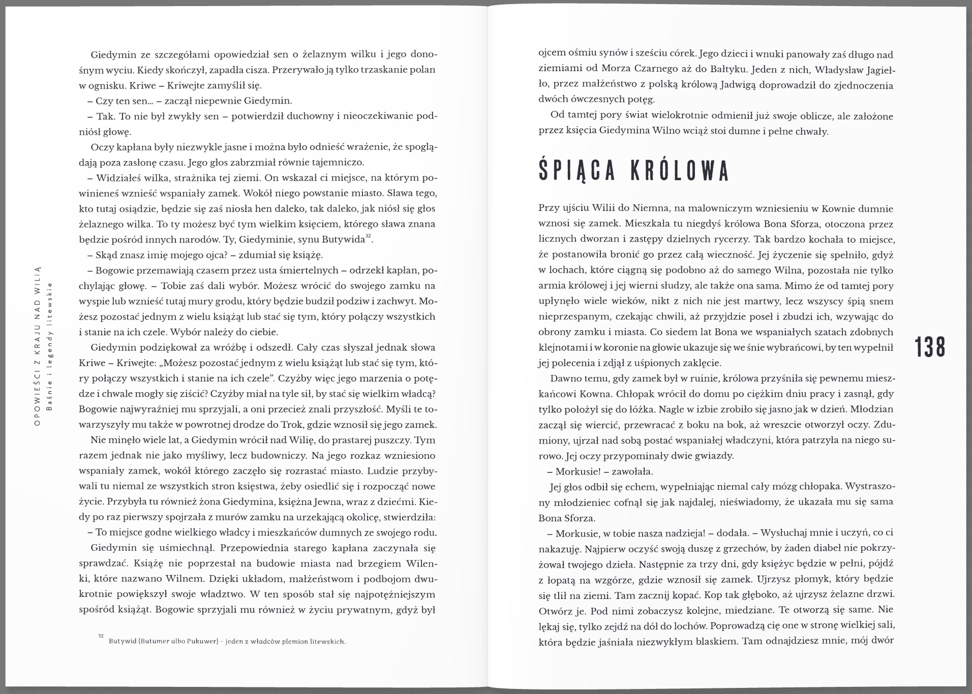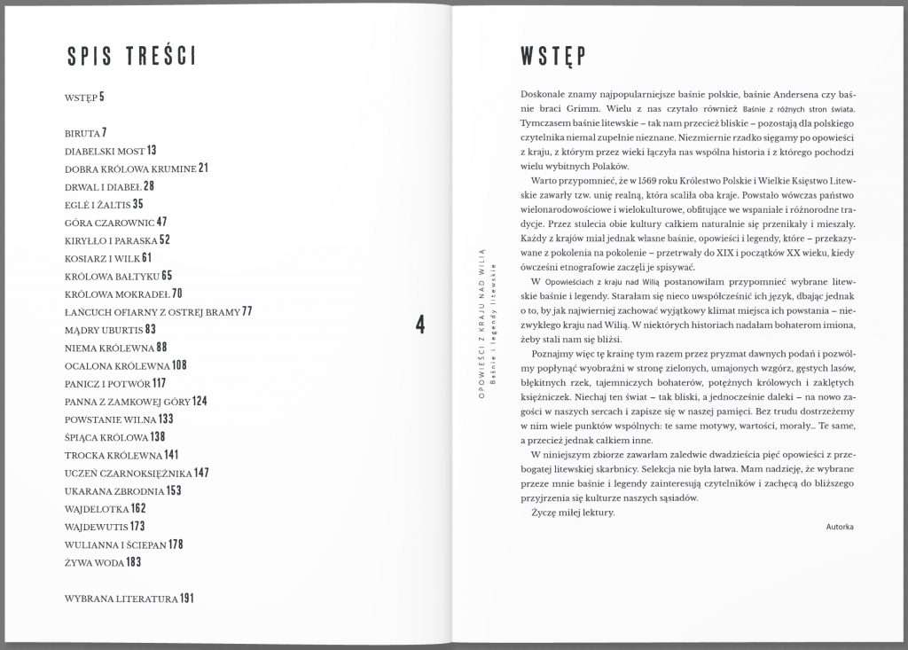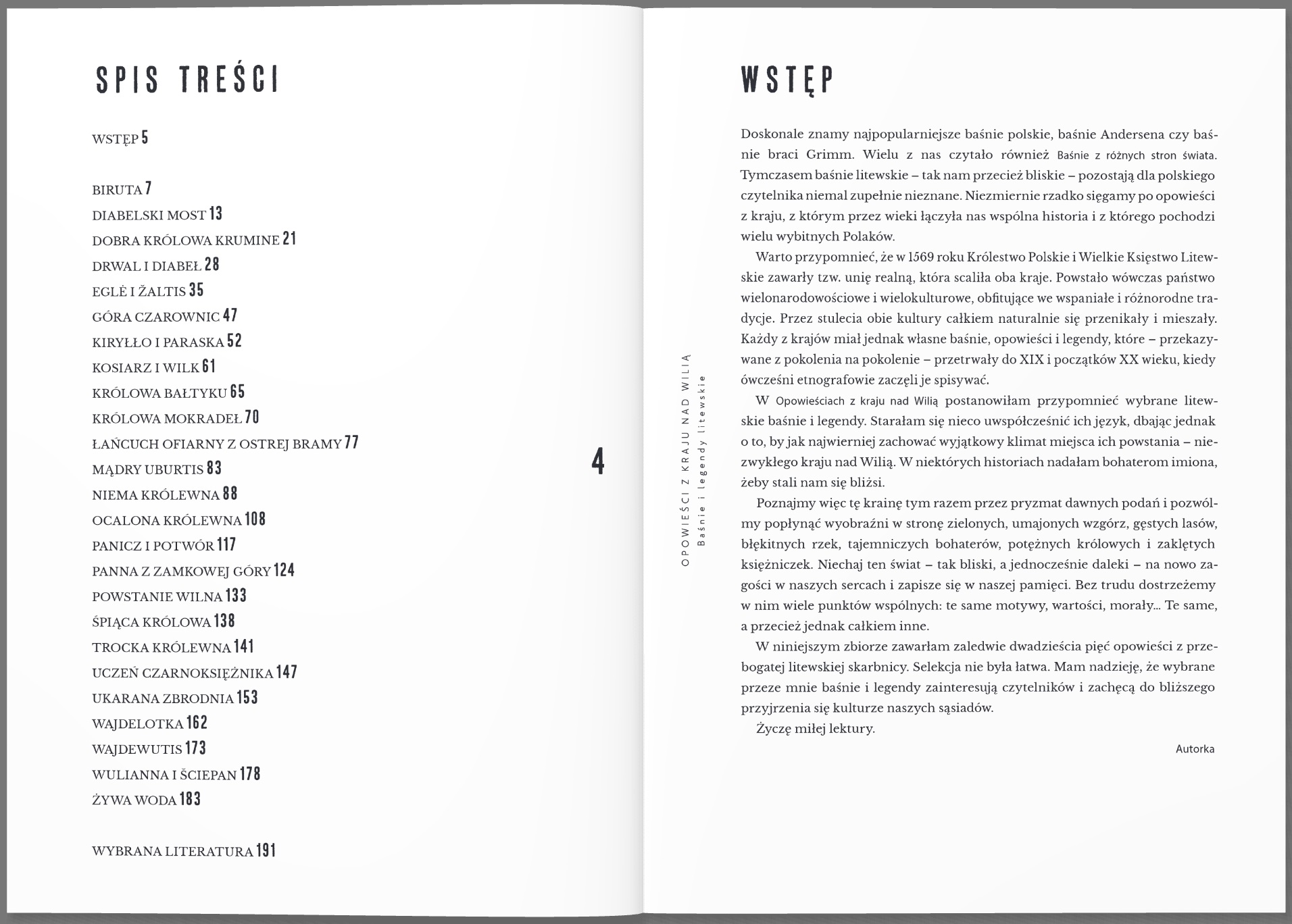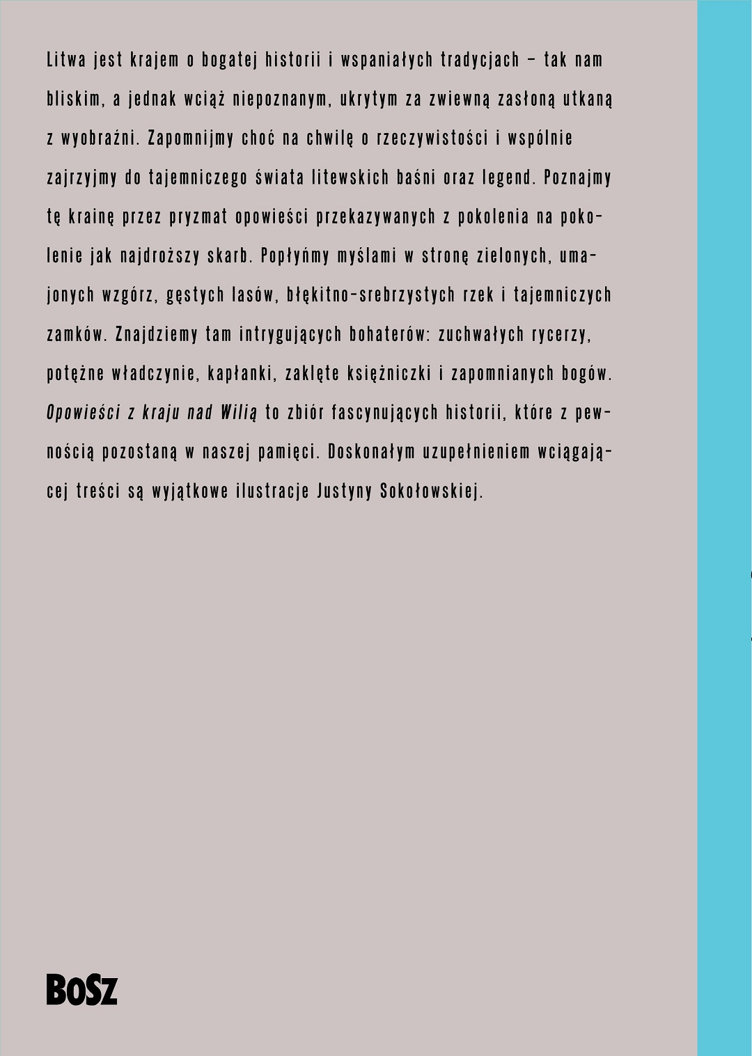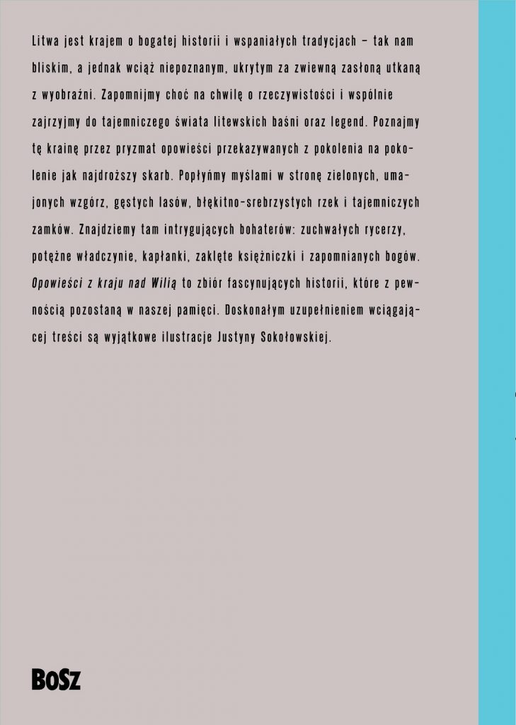 Opowieści z kraju nad Wilią, autorstwa Anny Koprowskiej-Głowackiej, to zbiór ponad dwudziestu baśni litewskich, odwołujących się do dawnych podań oraz legend. Wszystkie opowieści zostały zaczerpnięte ze źródeł etnograficznych, opracowane pod względem językowym i uwspółcześnione. W niektórych legendach autorka nadała bohaterom imiona, aby stali się bliżsi polskim czytelnikom. Każda historia stanowi zamkniętą całość, posiada odrębną fabułę oraz pouczający morał. Ta fascynująca lektura, dzięki której możemy poznać dziedzictwo kulturowe naszych litewskich sąsiadów, zabiera wyobraźnię do krainy zielonych, umajonych wzgórz, gęstych lasów, błękitnych rzek, tajemniczych bohaterów, potężnych królów i zaklętych księżniczek. Ponadto, tym co wyróżnia książkę spośród innych publikacji tego typu, są wyjątkowe ilustracje Justyny Sokołowskiej, będące doskonałym uzupełnieniem dla wciągającej treści.