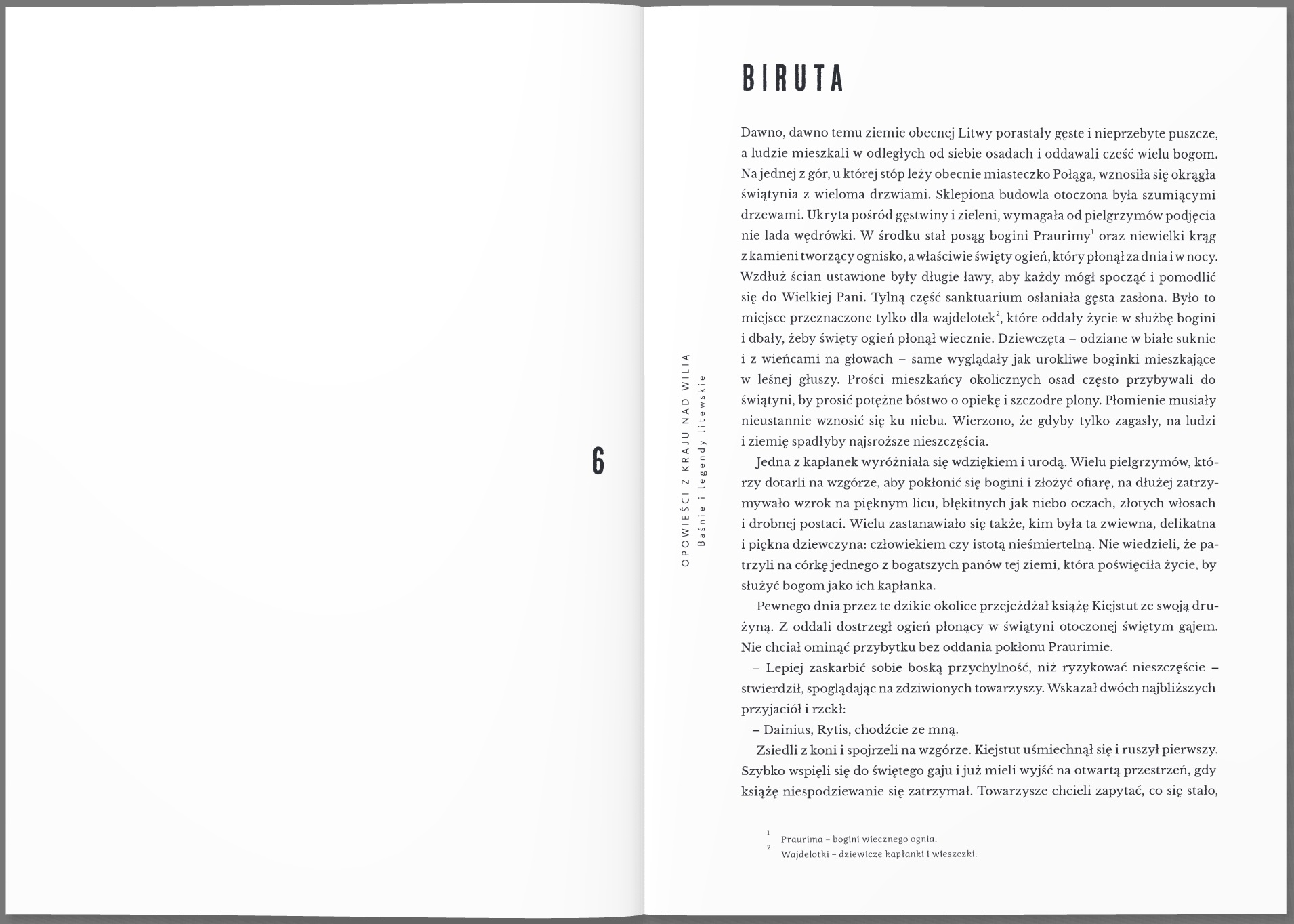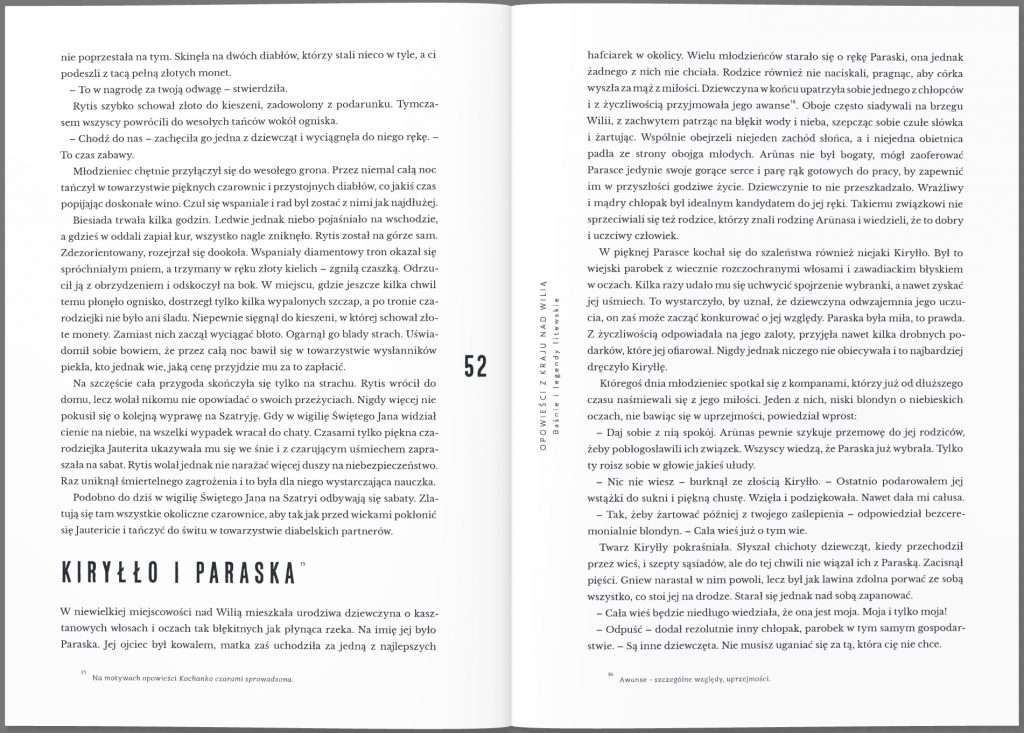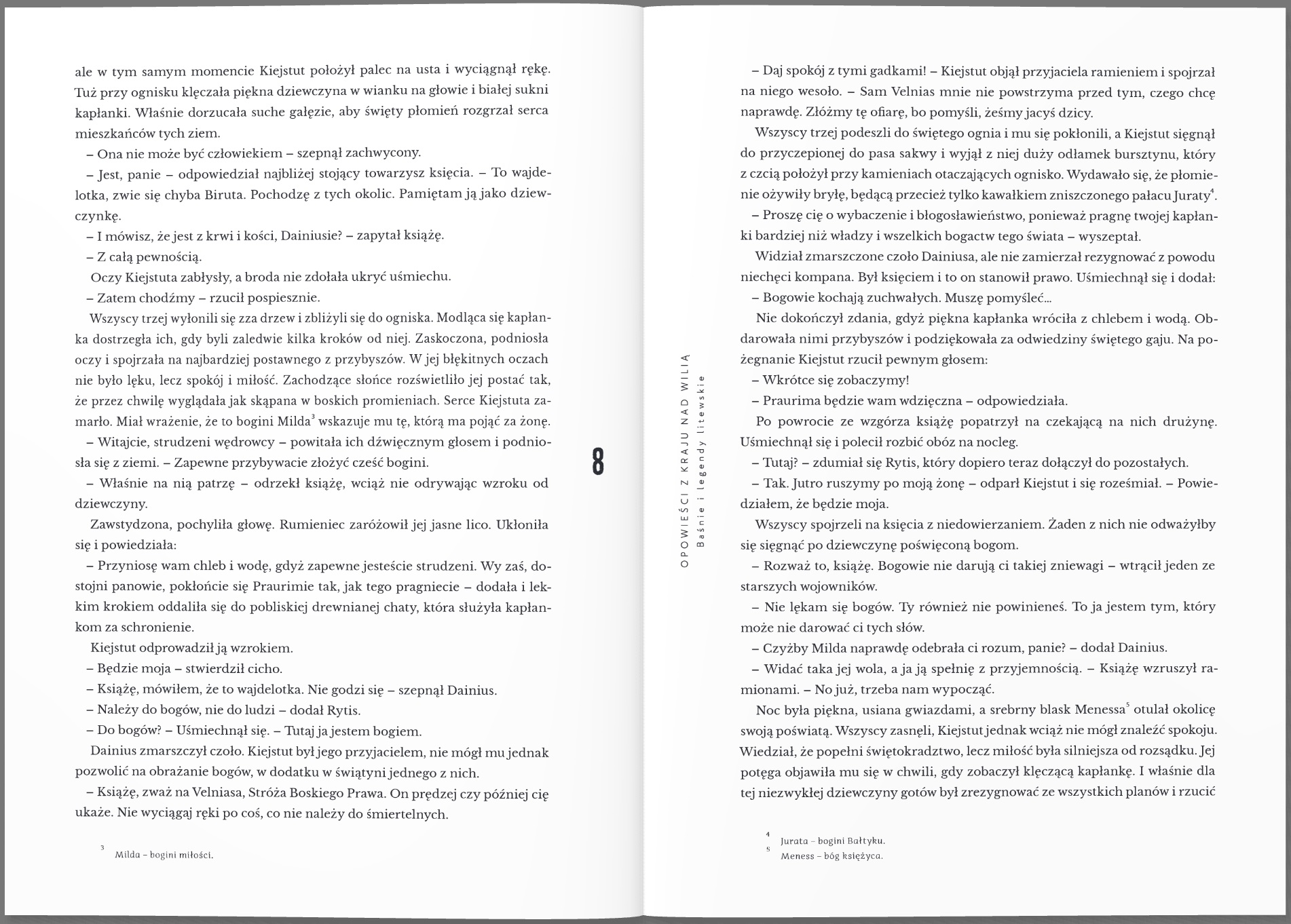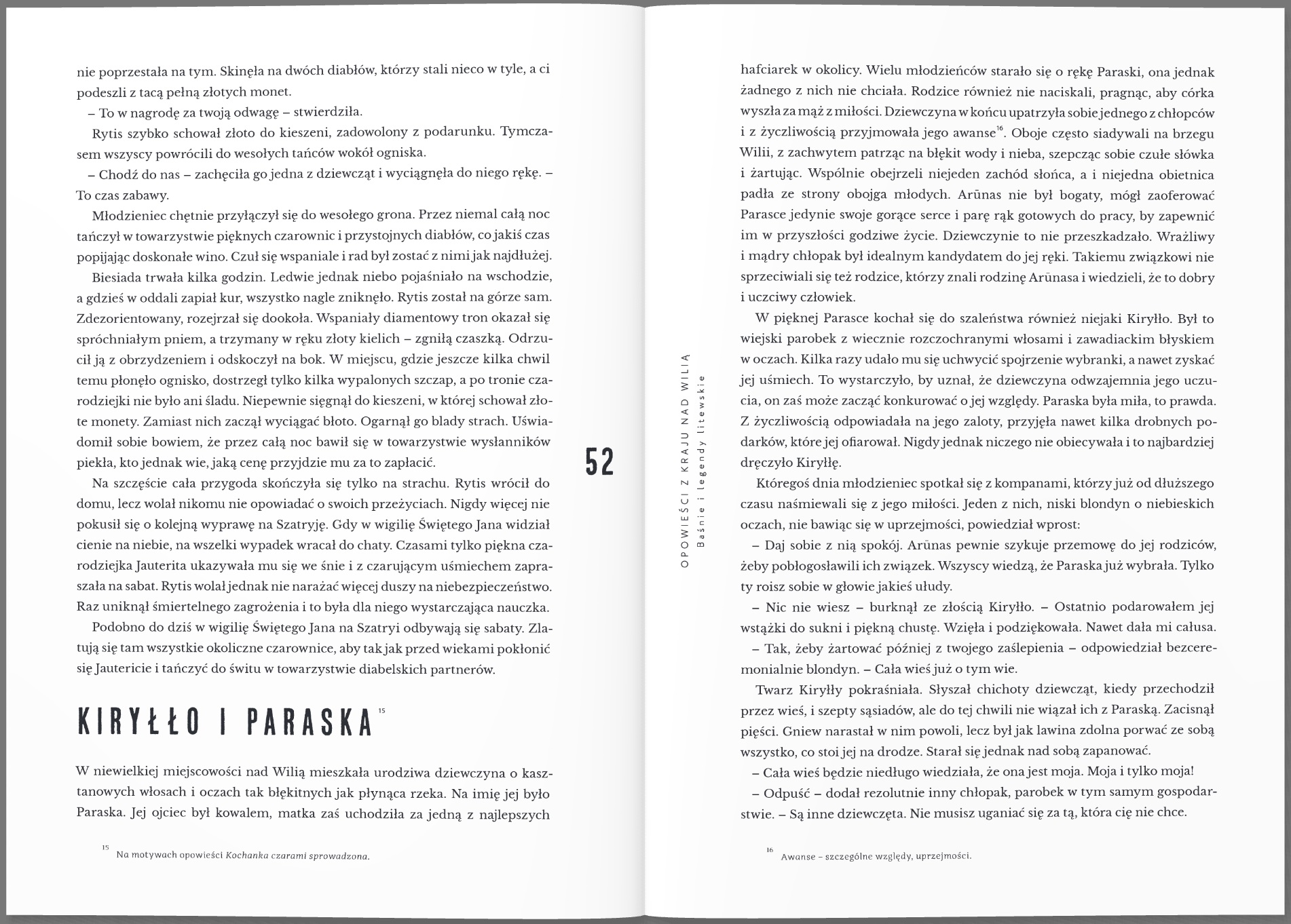 Opowieści z kraju nad Wilią, autorstwa Anny Koprowskiej-Głowackiej, to zbiór ponad dwudziestu baśni litewskich, odwołujących się do dawnych podań oraz legend. Wszystkie opowieści zostały zaczerpnięte ze źródeł etnograficznych, opracowane pod względem językowym i uwspółcześnione. W niektórych legendach autorka nadała bohaterom imiona, aby stali się bliżsi polskim czytelnikom. Każda historia stanowi zamkniętą całość, posiada odrębną fabułę oraz pouczający morał. Ta fascynująca lektura, dzięki której możemy poznać dziedzictwo kulturowe naszych litewskich sąsiadów, zabiera wyobraźnię do krainy zielonych, umajonych wzgórz, gęstych lasów, błękitnych rzek, tajemniczych bohaterów, potężnych królów i zaklętych księżniczek. Ponadto, tym co wyróżnia książkę spośród innych publikacji tego typu, są wyjątkowe ilustracje Justyny Sokołowskiej, będące doskonałym uzupełnieniem dla wciągającej treści.