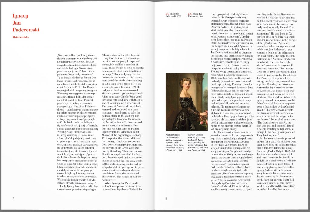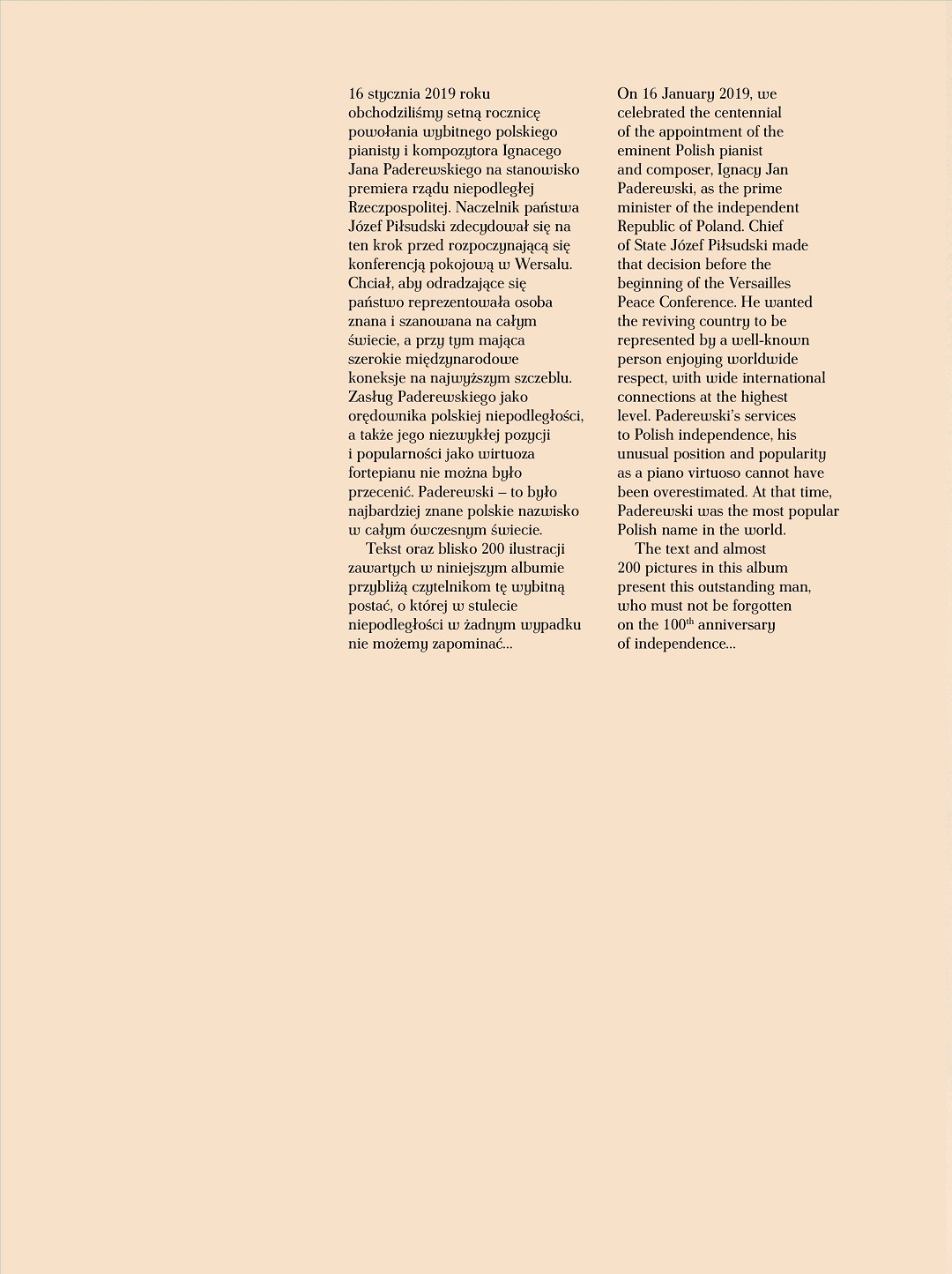16 stycznia 2019 roku mija sto lat od powołania wybitnego polskiego pianisty i kompozytora Ignacego Jana Paderewskiego na stanowisko premiera rządu niepodległej Rzeczpospolitej. Naczelnik Państwa Józef Piłsudski zdecydował się na ten krok przed rozpoczynającą się konferencją pokojową w Wersalu. Chciał, aby odradzające się państwo reprezentowała osoba znana i szanowana na całym świecie, a przy tym mająca szerokie międzynarodowe koneksje na najwyższym szczeblu. Zasług Paderewskiego jako orędownika polskiej niepodległości, przede wszystkim w USA, jego niezwykłej pozycji i popularności jako wirtuoza fortepianu nie można było przecenić. Paderewski – to było najbardziej znane polskie nazwisko w całym ówczesnym świecie. Tekst oraz blisko 170 ilustracji zawartych w tym albumie przybliżą czytelnikom tę wybitną postać, o której w stulecie niepodległości w żadnym wypadku nie możemy zapominać.