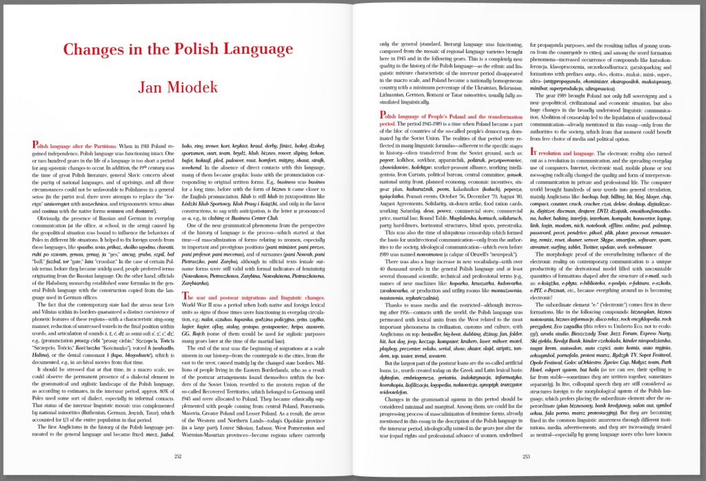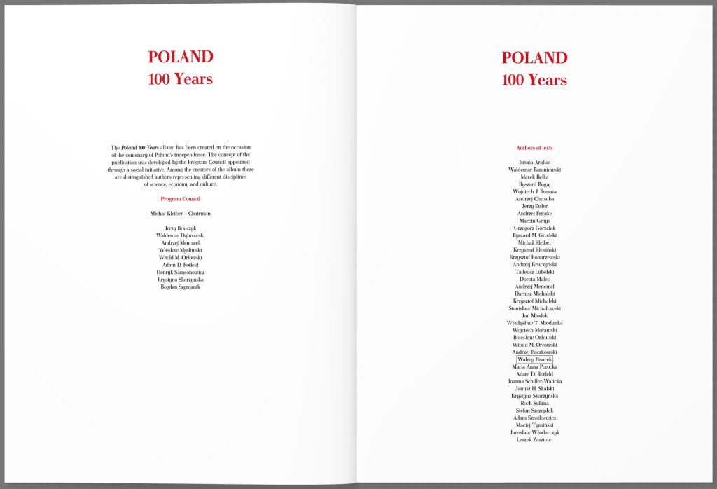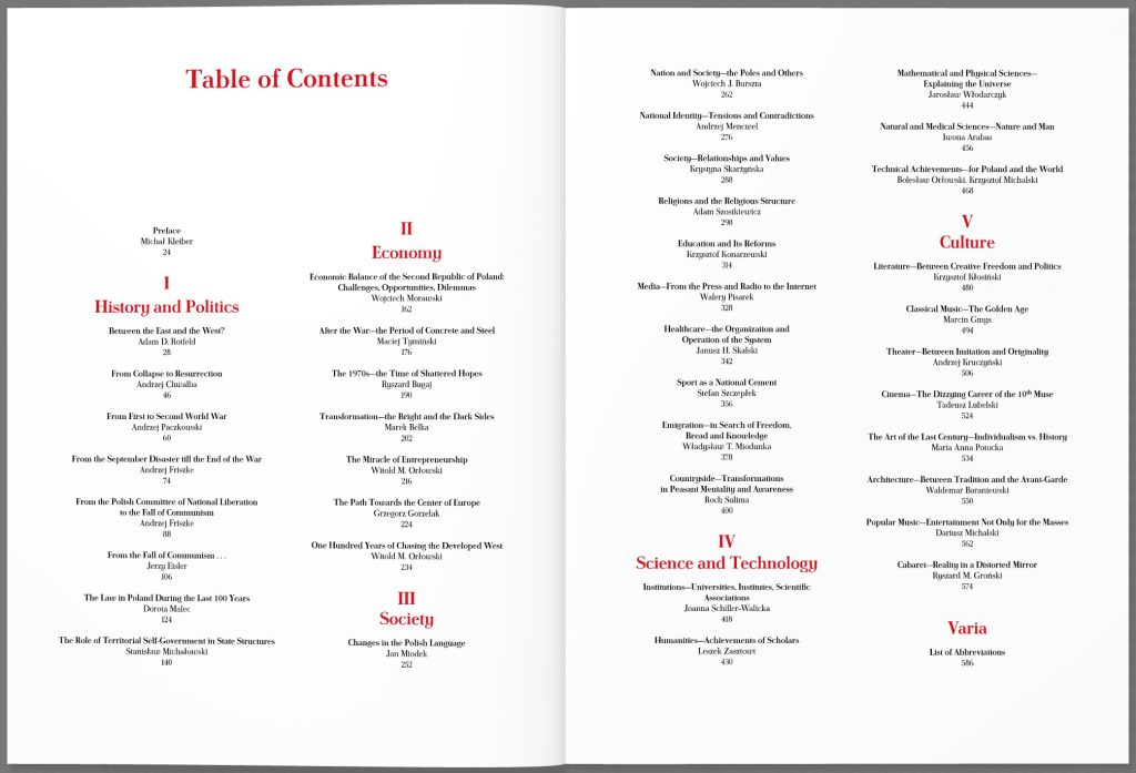 Książka składać się będzie z pięciu rozdziałów poświęconych polskiej historii, społeczeństwu, kulturze, nauce i gospodarce. Całość poprzedzać będzie wstęp historyczno-kulturowy. Autorami tekstów do tej publikacji, napisanych w formie esejów, są najwybitniejsi polscy uczeni związani z największych ośrodkami naukowymi w kraju, m.in. prof. M. Belka, A. Rotfeld, A. Chwalba, A. Friszke, J. Miodek, K. Skarżyńska, J. Skalski, J. Włodarczyk, W. Orłowski, R. Bugaj. W książce podjęte i zilustrowane zostaną rozważania na temat kształtowania się i rozwoju najważniejszych dziedzin życia narodu polskiego: skomplikowanej i trudnej historii Polski, jej suwerenności i transformacji dziejowej (przemian polityczno-gospodarczych), relacji i tożsamości społecznych, religii, oświaty, zdrowia, literatury i kultury, w tym: muzyki, filmu, sztuk pięknych i architektury. Nie zabraknie także omówienia rozwoju nauk technicznych czy przyrodniczo-medycznych.