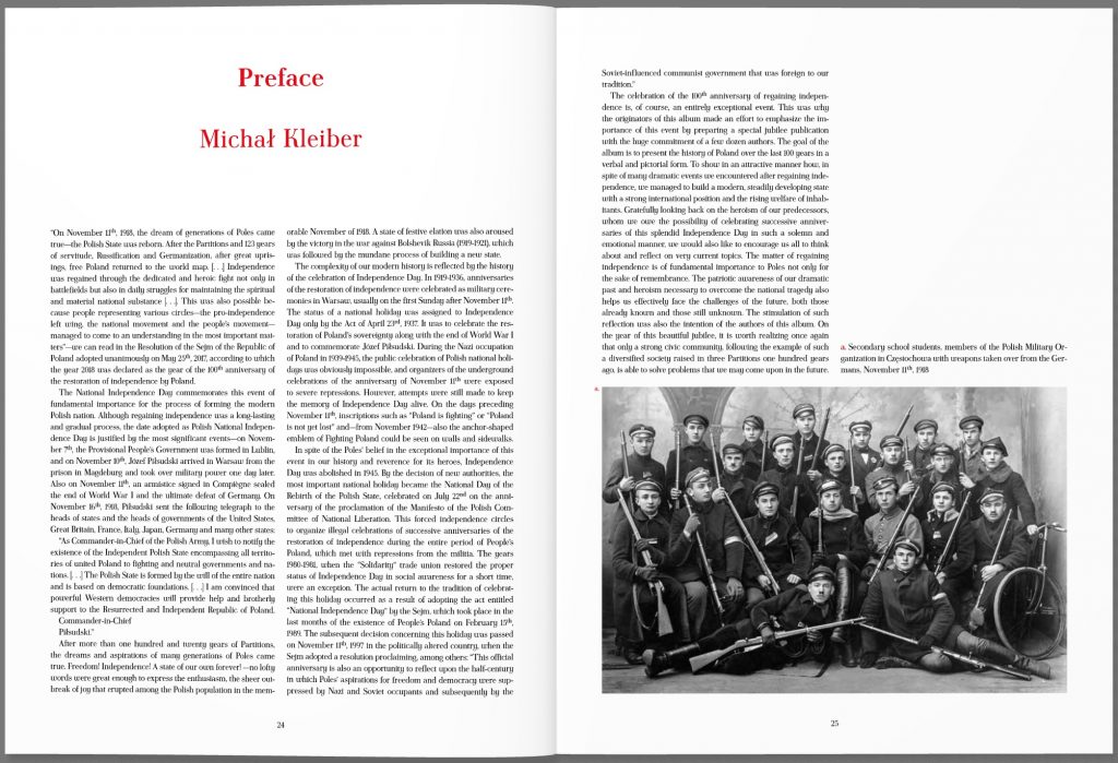 „Polska 100 lat” to bogato ilustrowany album przygotowywany w związku z przypadającą w 2018 roku setną rocznicą odzyskania przez Polskę niepodległości. Pracami nad powstaniem tej wyjątkowej publikacji kieruje powołana z inicjatywy społecznej Rada Programowa, w skład której wchodzą m.in.: profesorowie M. Kleiber, A. Mencwel, H. Samsonowicz, J. Bralczyk oraz wybitni znawcy polskiej kultury: pisarz W. Myśliwski, dyrektor Teatru Wielkiego – Opery Narodowej – W. Dąbrowski, czy polski dyplomata, badacz stosunków międzynarodowych prof. A. Rotfeld.