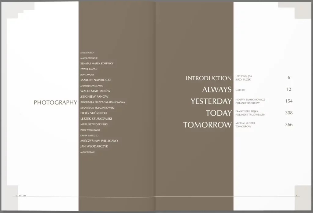 Dla jak najlepszego zobrazowania tych niezwykle różnorodnych tematów publikację podzielono na cztery części – rozdziały. 'Zawsze’ – poświęcony przyrodzie, 'Wczoraj’ – dotyczący historii i tradycji, 'Dzisiaj’ – przedstawiający naszą współczesność oraz 'Jutro’ – w którym poruszono temat przyszłości Polski.