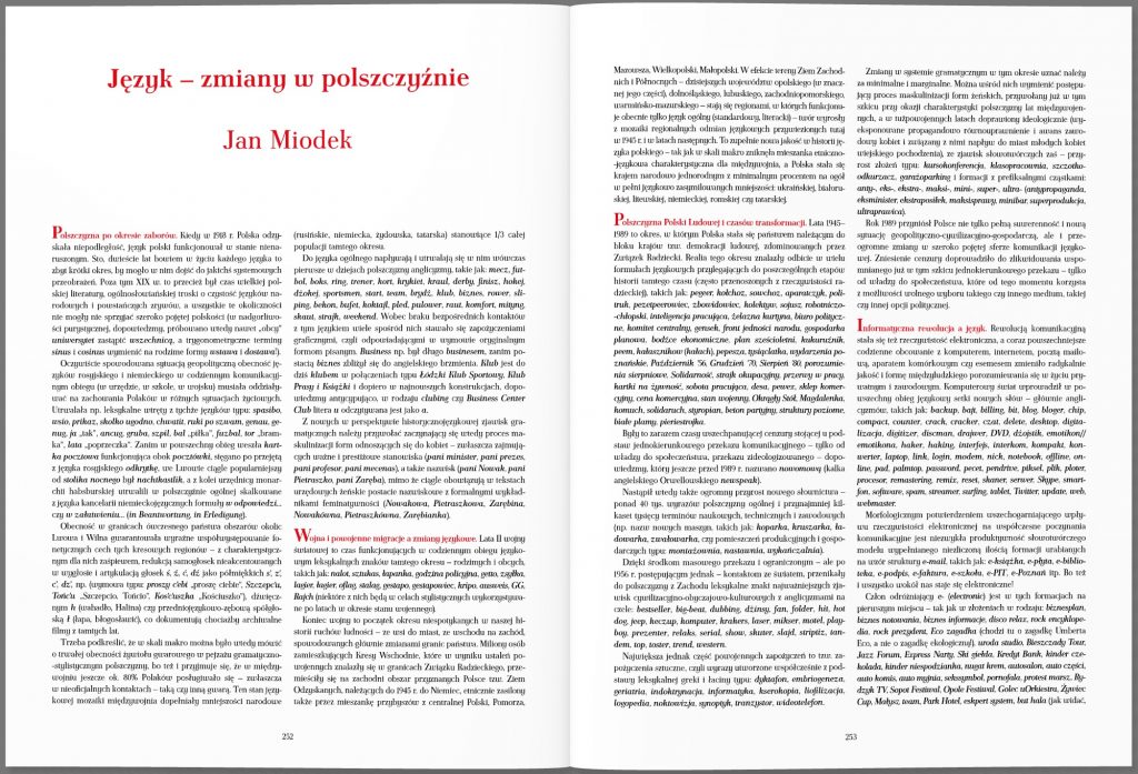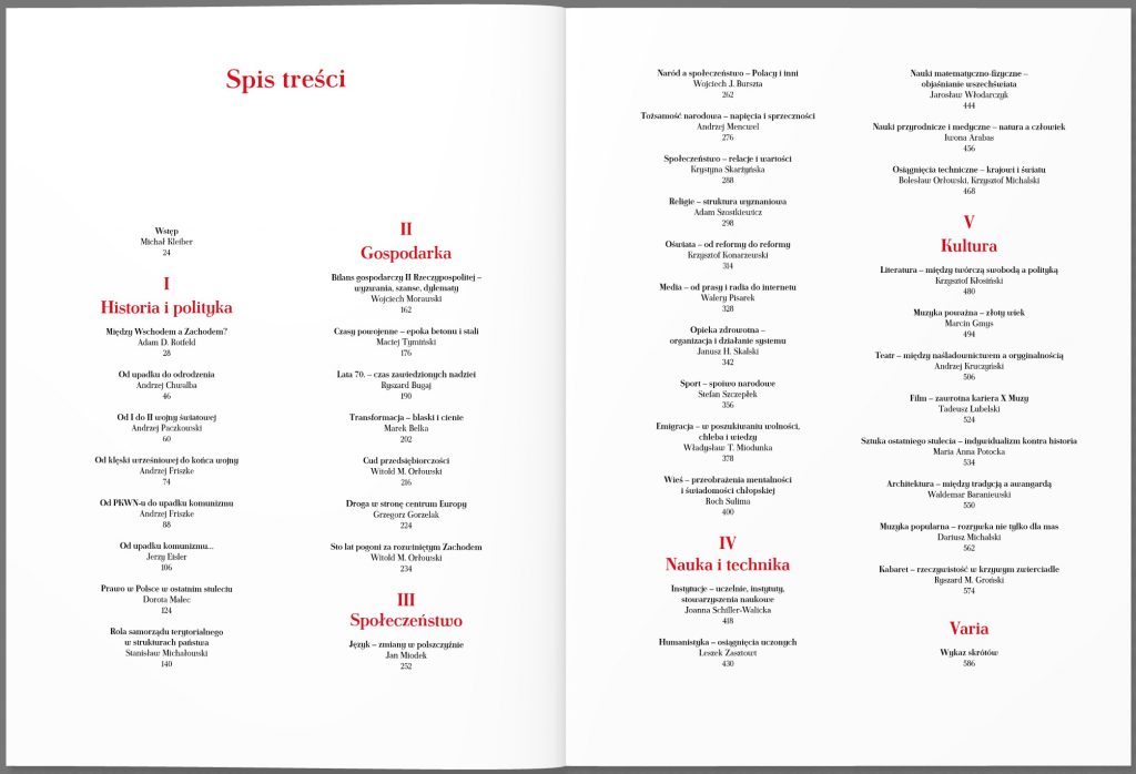 Książka składać się będzie z pięciu rozdziałów poświęconych polskiej historii, społeczeństwu, kulturze, nauce i gospodarce. Całość poprzedzać będzie wstęp historyczno-kulturowy. Autorami tekstów do tej publikacji, napisanych w formie esejów, są najwybitniejsi polscy uczeni związani z największych ośrodkami naukowymi w kraju, m.in. prof. M. Belka, A. Rotfeld, A. Chwalba, A. Friszke, J. Miodek, K. Skarżyńska, J. Skalski, J. Włodarczyk, W. Orłowski, R. Bugaj. W książce podjęte i zilustrowane zostaną rozważania na temat kształtowania się i rozwoju najważniejszych dziedzin życia narodu polskiego: skomplikowanej i trudnej historii Polski, jej suwerenności i transformacji dziejowej (przemian polityczno-gospodarczych), relacji i tożsamości społecznych, religii, oświaty, zdrowia, literatury i kultury, w tym: muzyki, filmu, sztuk pięknych i architektury. Nie zabraknie także omówienia rozwoju nauk technicznych czy przyrodniczo-medycznych.