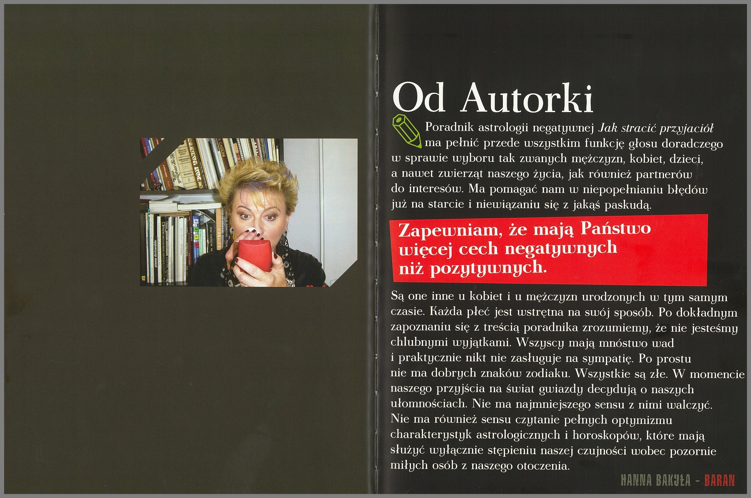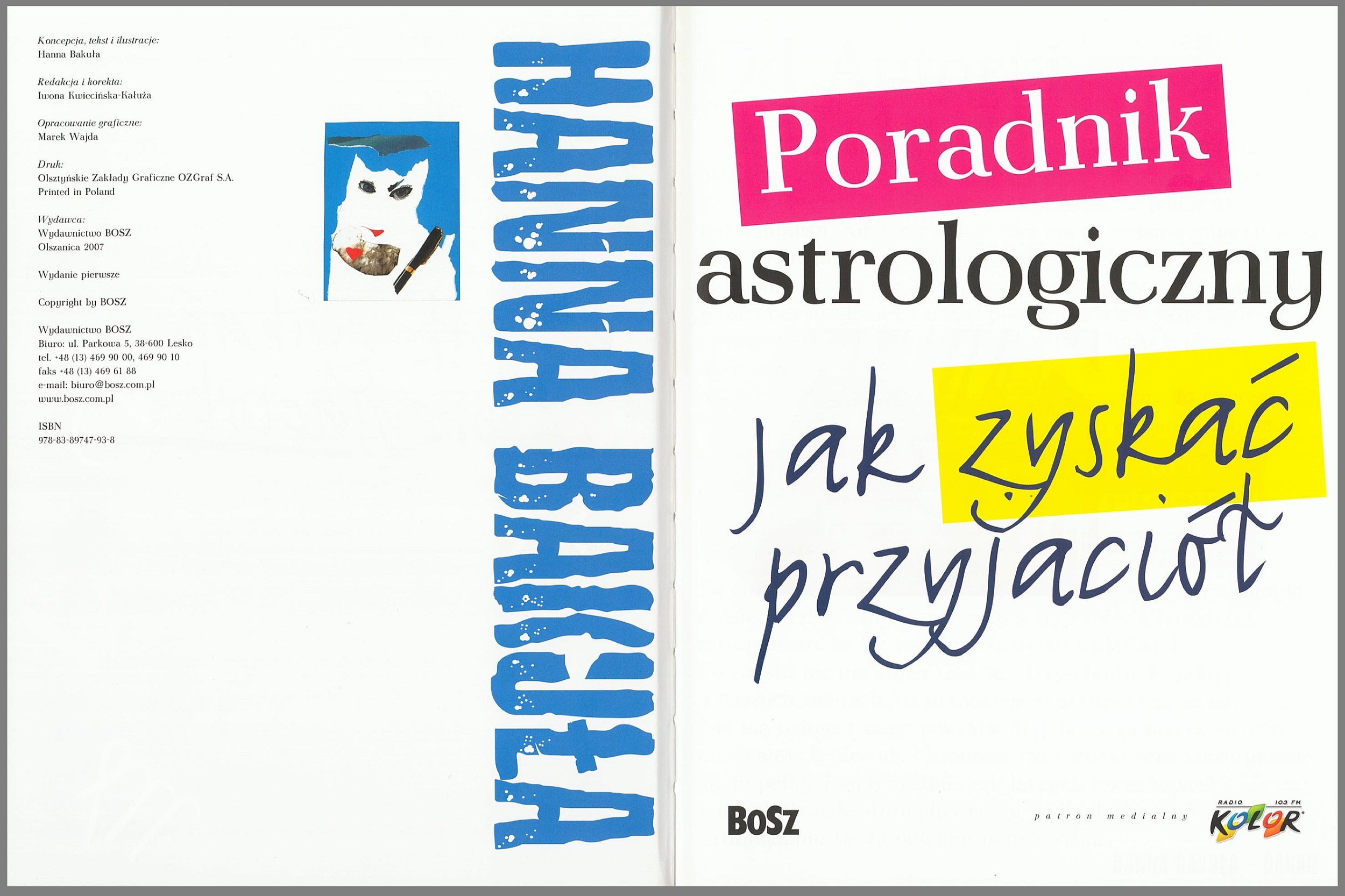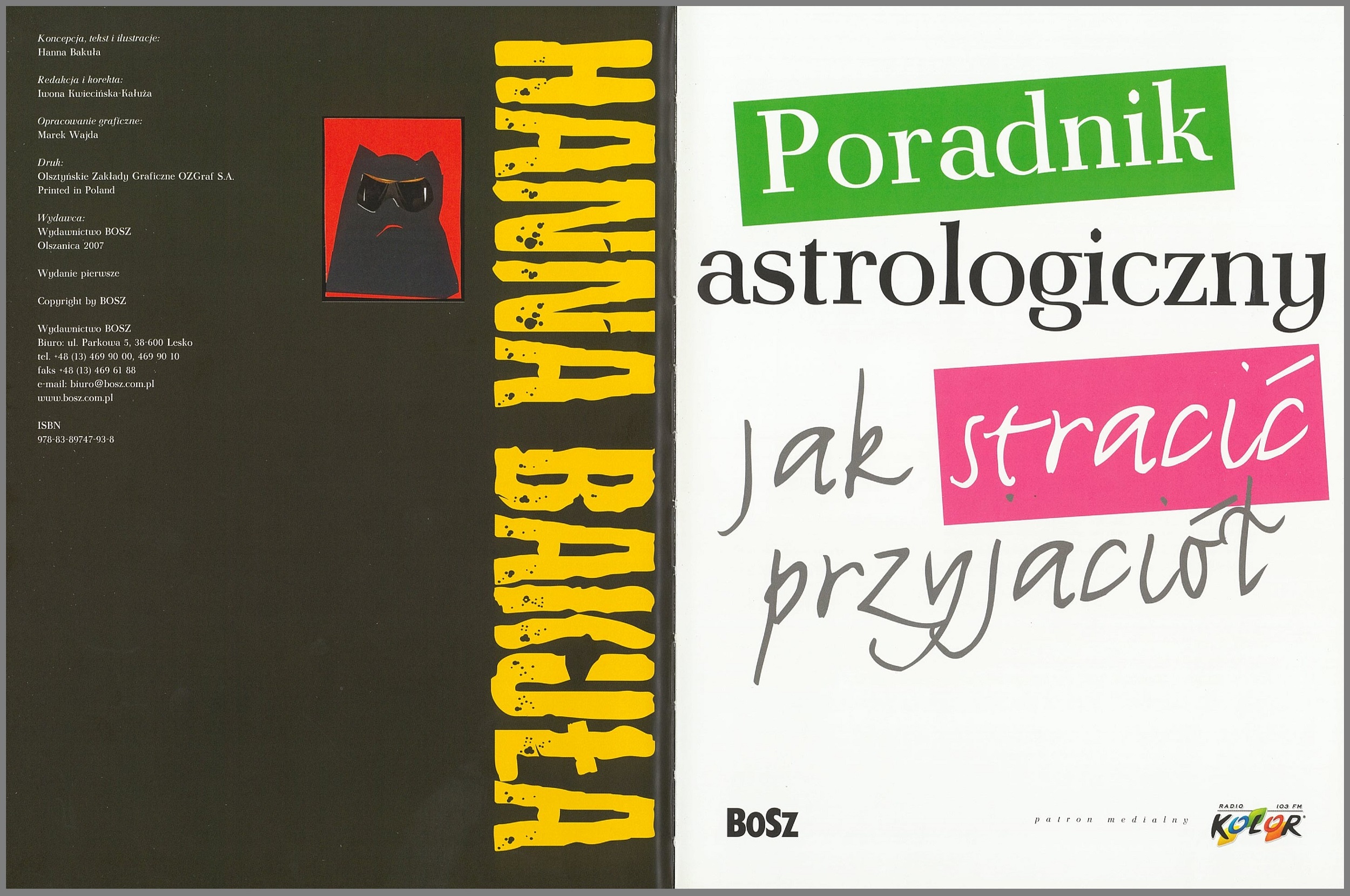 Poradnik astrologiczny Hanny Bakuły to skrzące się dowcipem i humorem pozytywne i negatywne charakterystyki poszczególnych znaków Zodiaku. W zależności od tego, od której strony – czarnej czy białej – zaczniemy czytać książkę, dostaniemy albo pełen pochwał, albo najeżony krytyką opis osób, które urodziły się w poszczególnych miesiącach. Uzupełnieniem tych zabawnych, świetnie napisanych tekstów są wykazy sławnych osób spod danego znaku. Całość ubarwiają zharmonizowane z koncepcją książki ilustracje autorki.