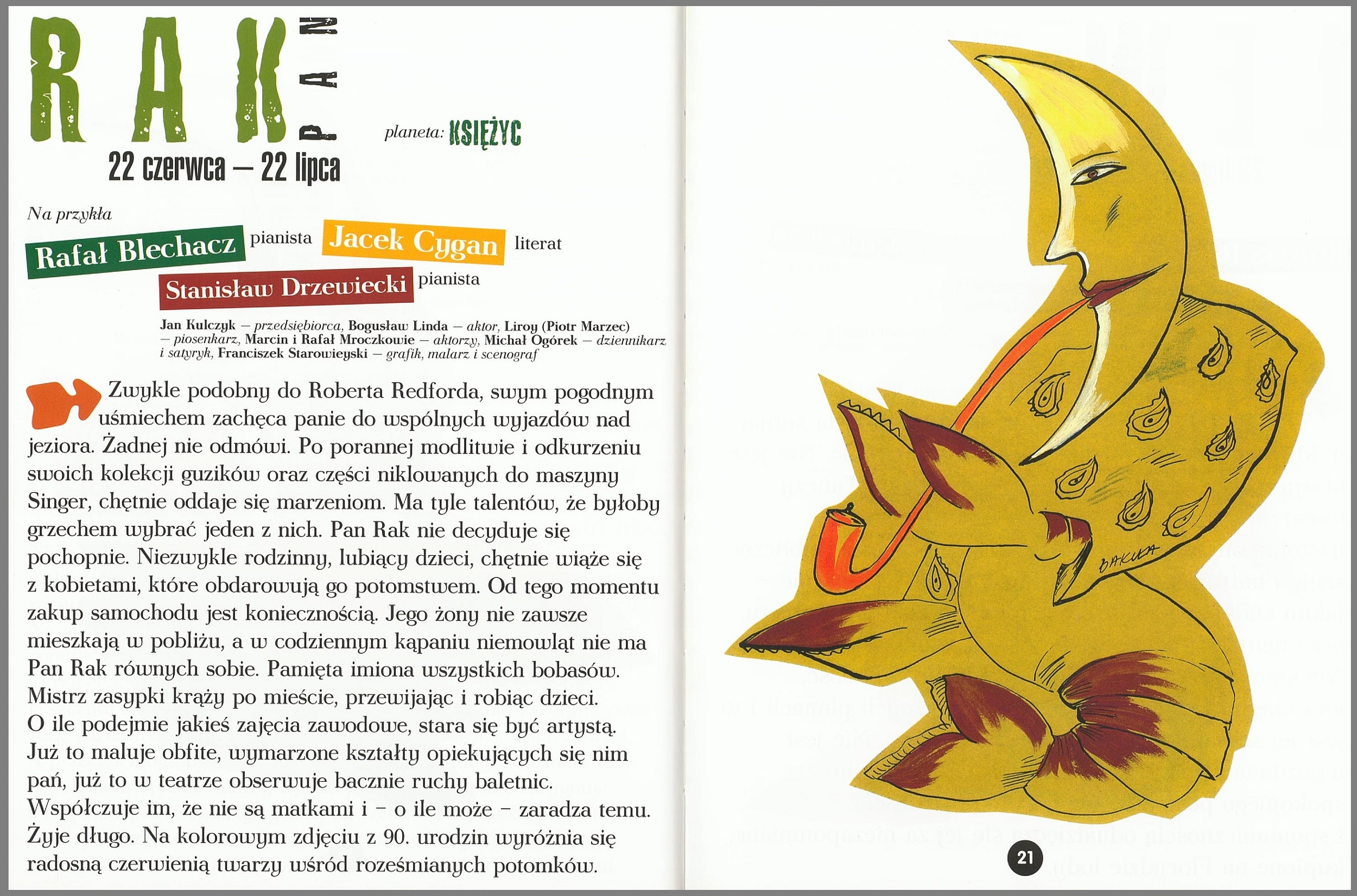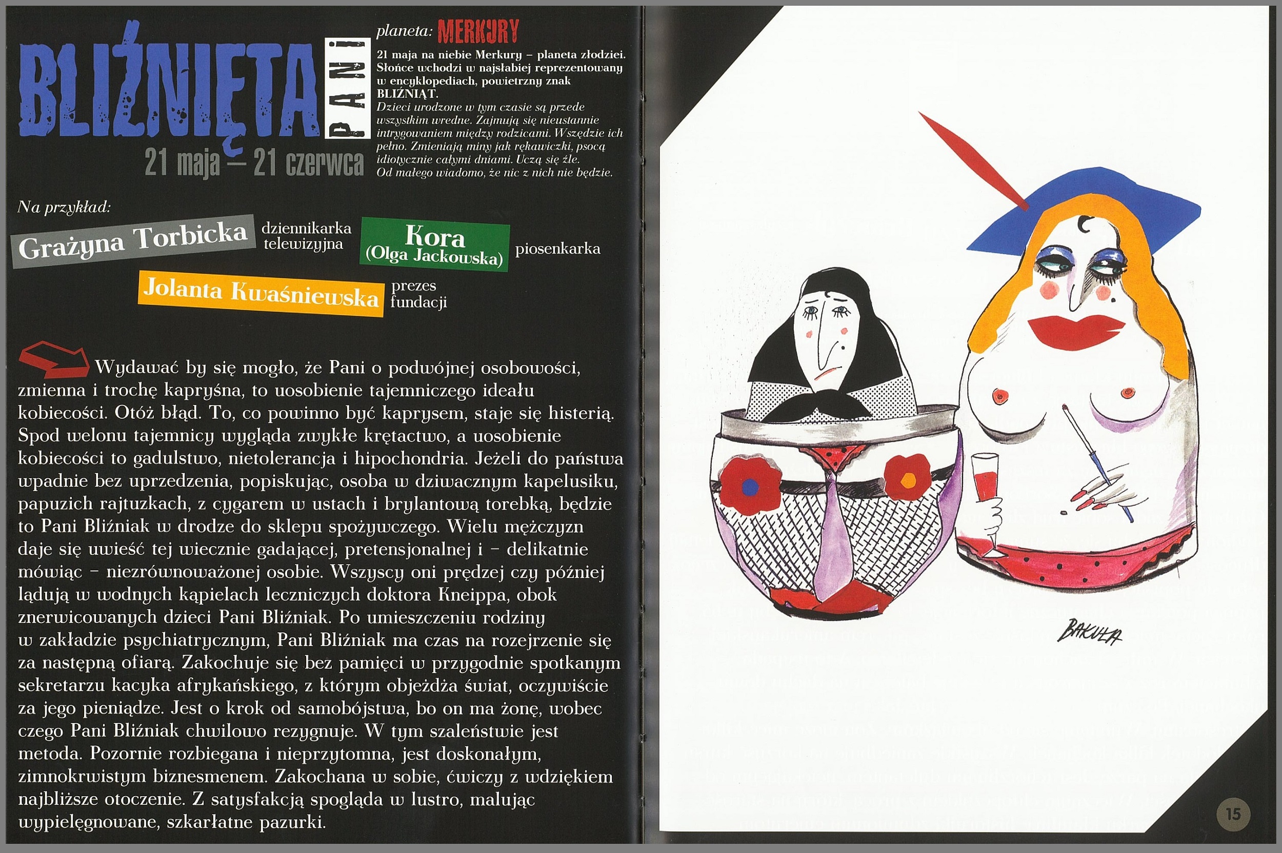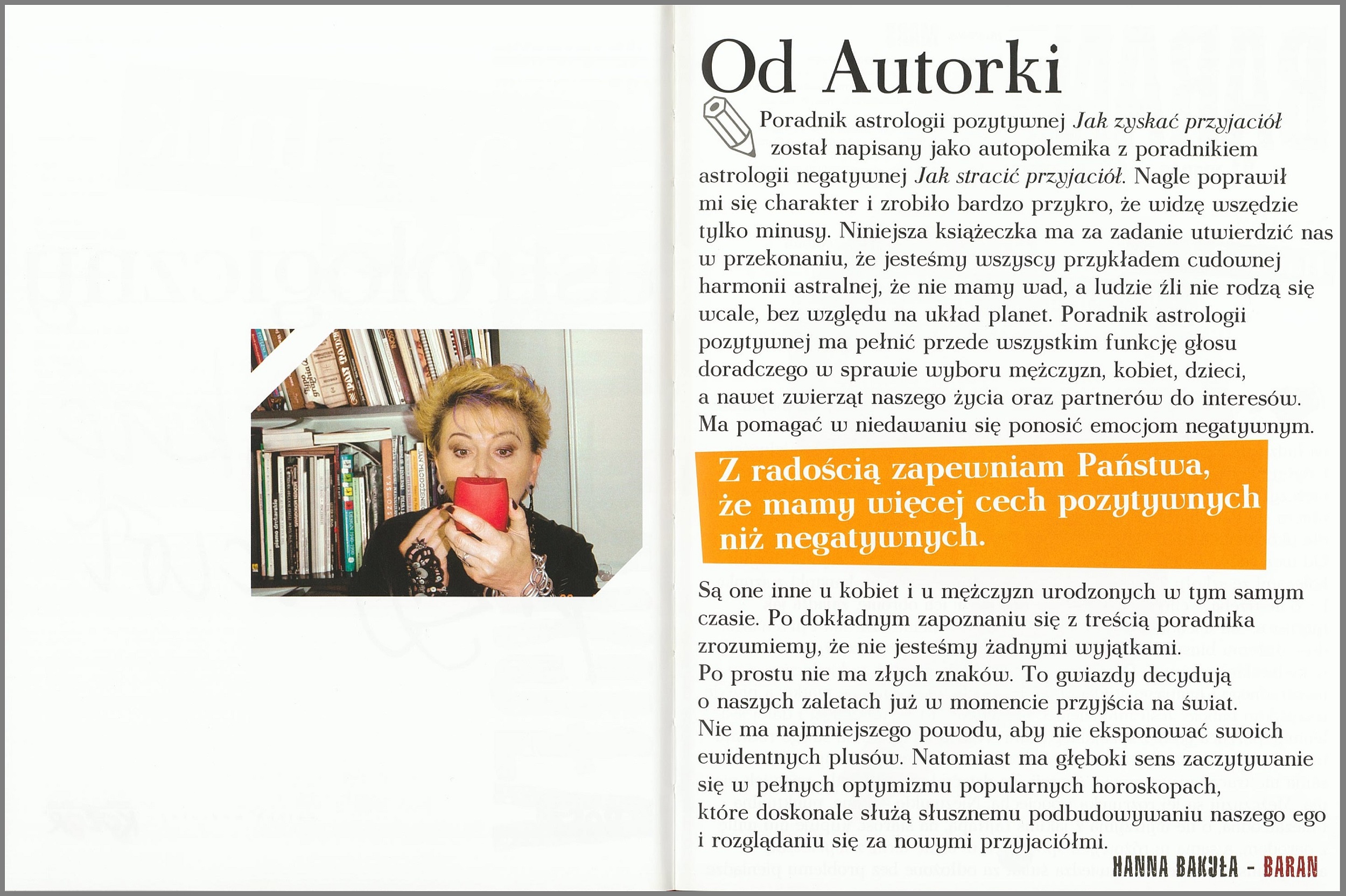 Poradnik astrologiczny Hanny Bakuły to skrzące się dowcipem i humorem pozytywne i negatywne charakterystyki poszczególnych znaków Zodiaku. W zależności od tego, od której strony – czarnej czy białej – zaczniemy czytać książkę, dostaniemy albo pełen pochwał, albo najeżony krytyką opis osób, które urodziły się w poszczególnych miesiącach. Uzupełnieniem tych zabawnych, świetnie napisanych tekstów są wykazy sławnych osób spod danego znaku. Całość ubarwiają zharmonizowane z koncepcją książki ilustracje autorki.