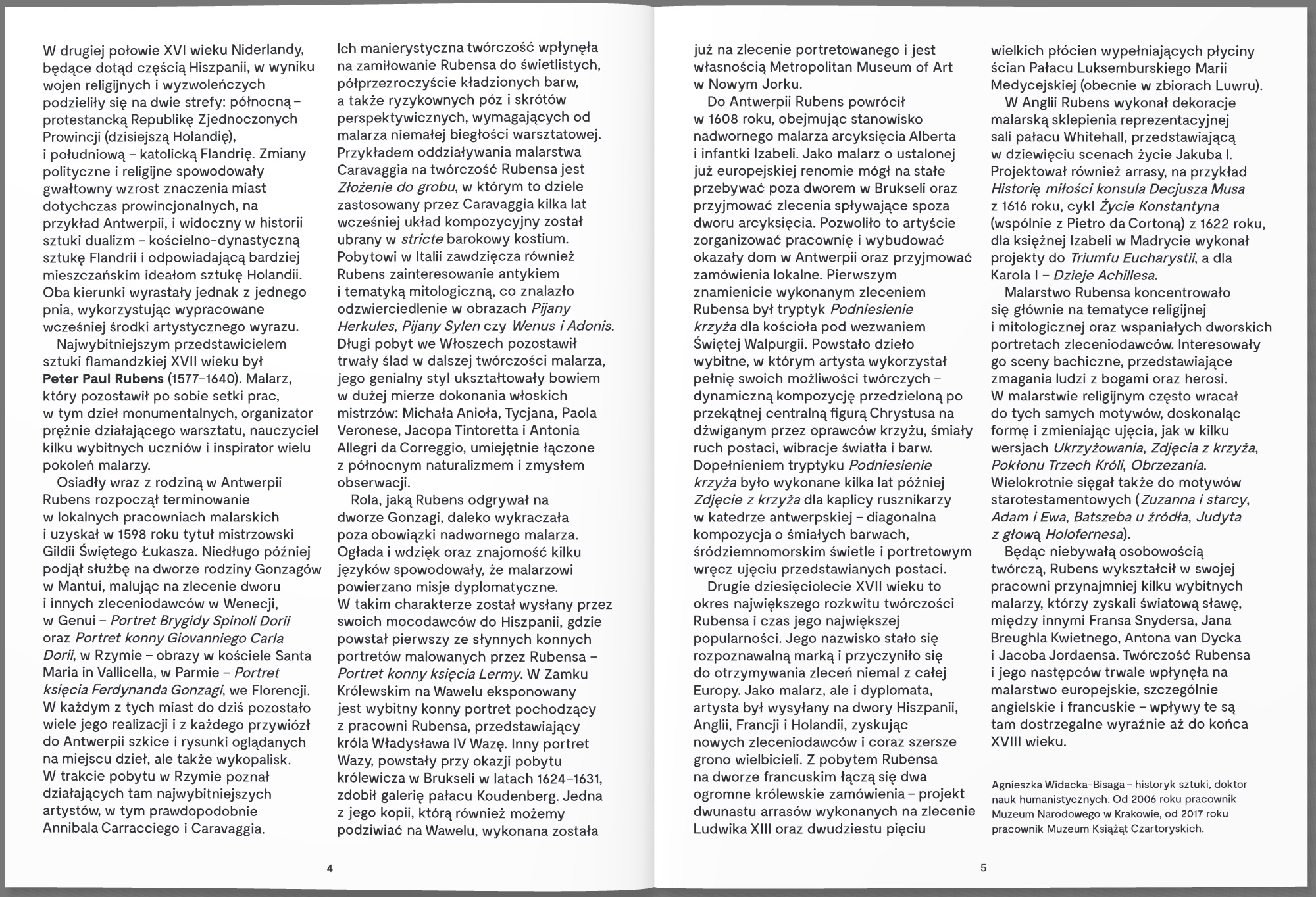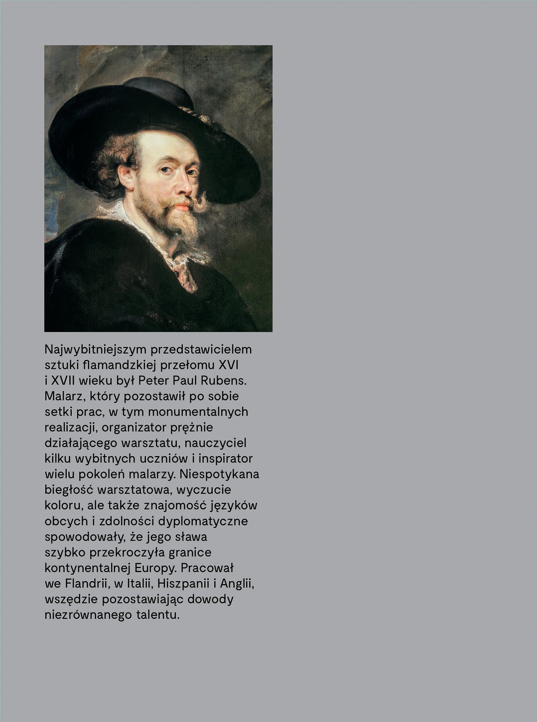 Paul Peter Rubens jest jednym z najbardziej znanych przedstawicieli malarstwa flamandzkiego na świecie. Jego niesamowity talent, pracowitość, zmysł dyplomacji i organizacji zapewniły mu sławę, uznanie oraz bogactwo jeszcze za życia. Malarstwo Rubensa zachwycało już w czasach, kiedy tworzył, obecnie jego twórczość olśniewa ze zdwojoną siłą, inspirując kolejne pokolenia artystów. Wielość tematów czerpanych z motywów biblijnych i mitologii oraz obfitość kształtów i kolorów są charakterystyczne dla twórczości tego niezwykłego artysty. Rubens gościł na wszystkich dworach europejskich, odbywając podróże dyplomatyczne, które zaowocowały wieloma znakomitymi portretami, m.in. Ludwika XIII, Anny Austriaczki czy Filipa IV Habsburga. Artysta stworzył w swoim domu w Antwerpii nowoczesną pracownię, w której przebywali tak znani malarze jak Antoon van Dyck czy Jan Brueghel.