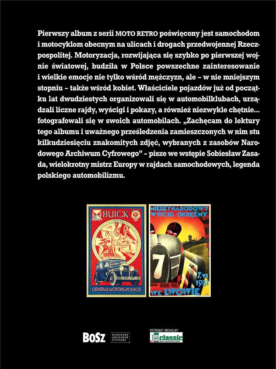 Album z serii MOTO RETRO poświęcony jest samochodom i motocyklom obecnym na ulicach i drogach przedwojennej Rzeczpospolitej. Motoryzacja, rozwijająca się szybko po pierwszej wojnie światowej, budziła w Polsce powszechne zainteresowanie i wielkie emocje nie tylko wśród mężczyzn, ale – w nie mniejszym stopniu – także wśród kobiet. Właściciele pojazdów już od początku lat 20. organizowali się w automobilklubach, urządzali liczne rajdy, wyścigi i pokazy, a także niezwykle chętnie… fotografowali się w swoich 'automobilach’. Wszystkie zdjęcia prezentowane w albumie pochodzą ze zbiorów Narodowego Archiwum Cyfrowego.
