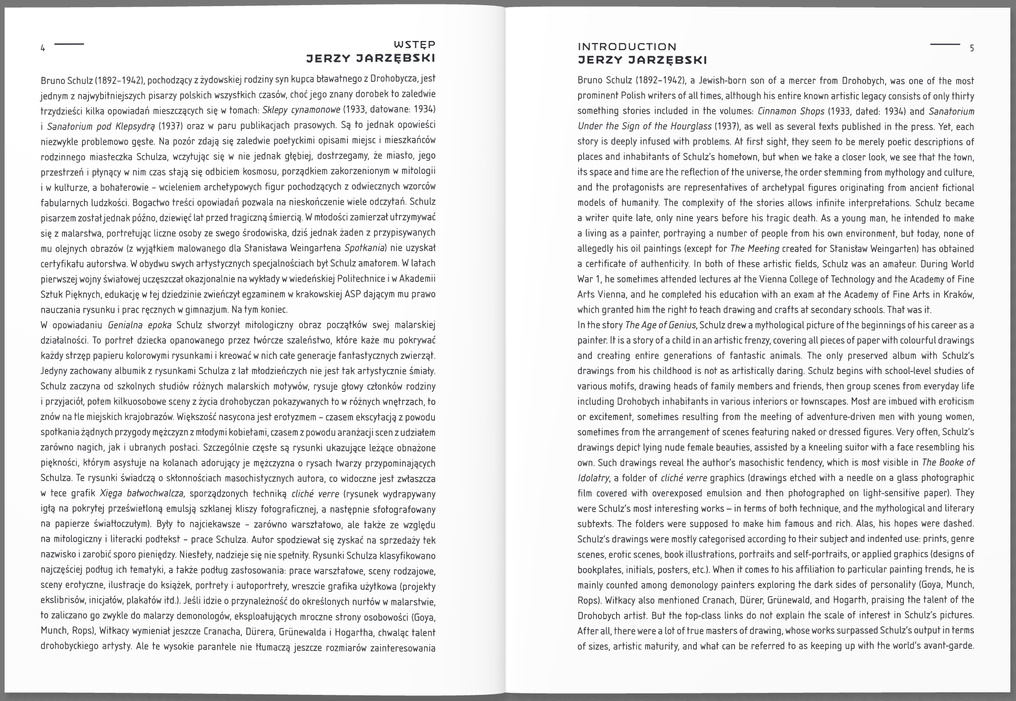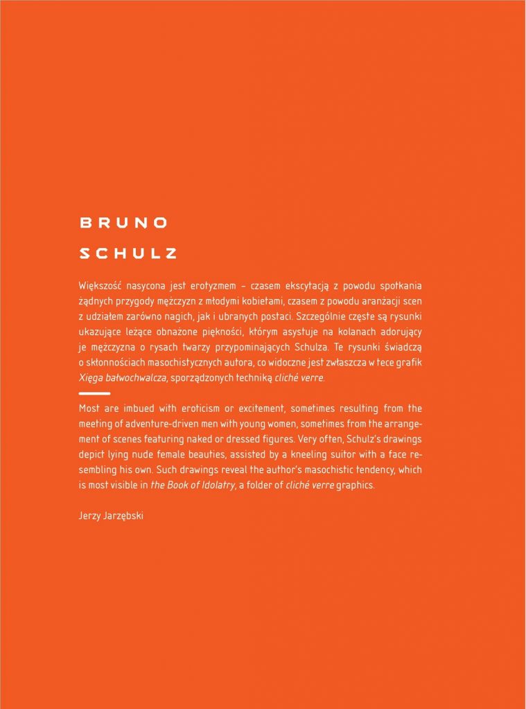 Bruno Schulz (1892-1942) – grafik, malarz, rysownik, a także pisarz, autor uznanych dzieł literackich: Sklepów cynamonowych oraz Sanatorium pod Klepsydrą. Album poświęcony jest twórczości rysunkowej artysty, w której przejawiały się skrywane przez niego obsesje. W efekcie mamy do czynienia z pracami pełnymi niepokoju, groteskowości i przewrotnej interpretacji ludzkiej natury. Autorem wstępu do albumu jest wybitny znawca twórczości Schulza, prof. Jerzy Jarzębski.