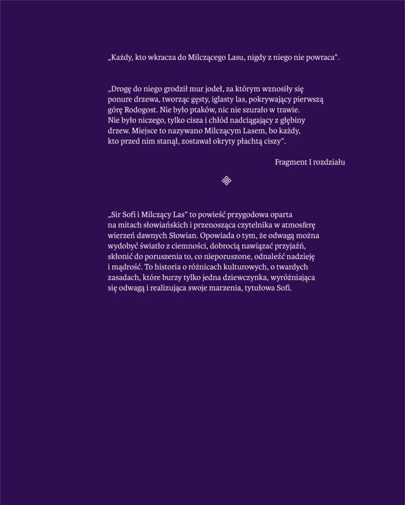 Sir Sofi i Milczący Las to opowieść przygodowa oparta na mitach słowiańskich i utrzymana w duchu wierzeń dawnych Słowian. Opowiada o tym, że odwagą można wydobyć światło z ciemności, dobrocią nawiązać przyjaźń, skłonić do poruszenia to, co nieporuszone, odnaleźć nadzieję, mądrość. To historia o różnicach kulturowych, o twardych zasadach, które burzy tylko jedna dziewczynka. Wielowątkowość, aspekt kulturowy i tolerancyjny dostarczy rozrywki zarówno młodszym, jak i starszym czytelnikom, skłaniając do rozmyślań, refleksji i dyskusji.