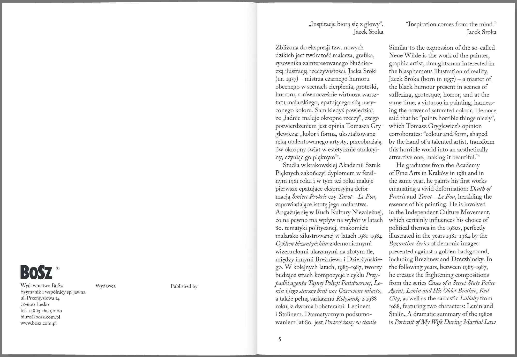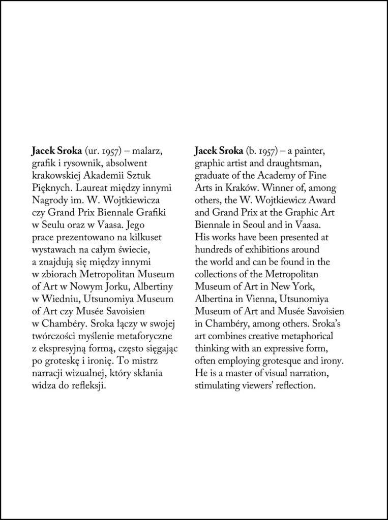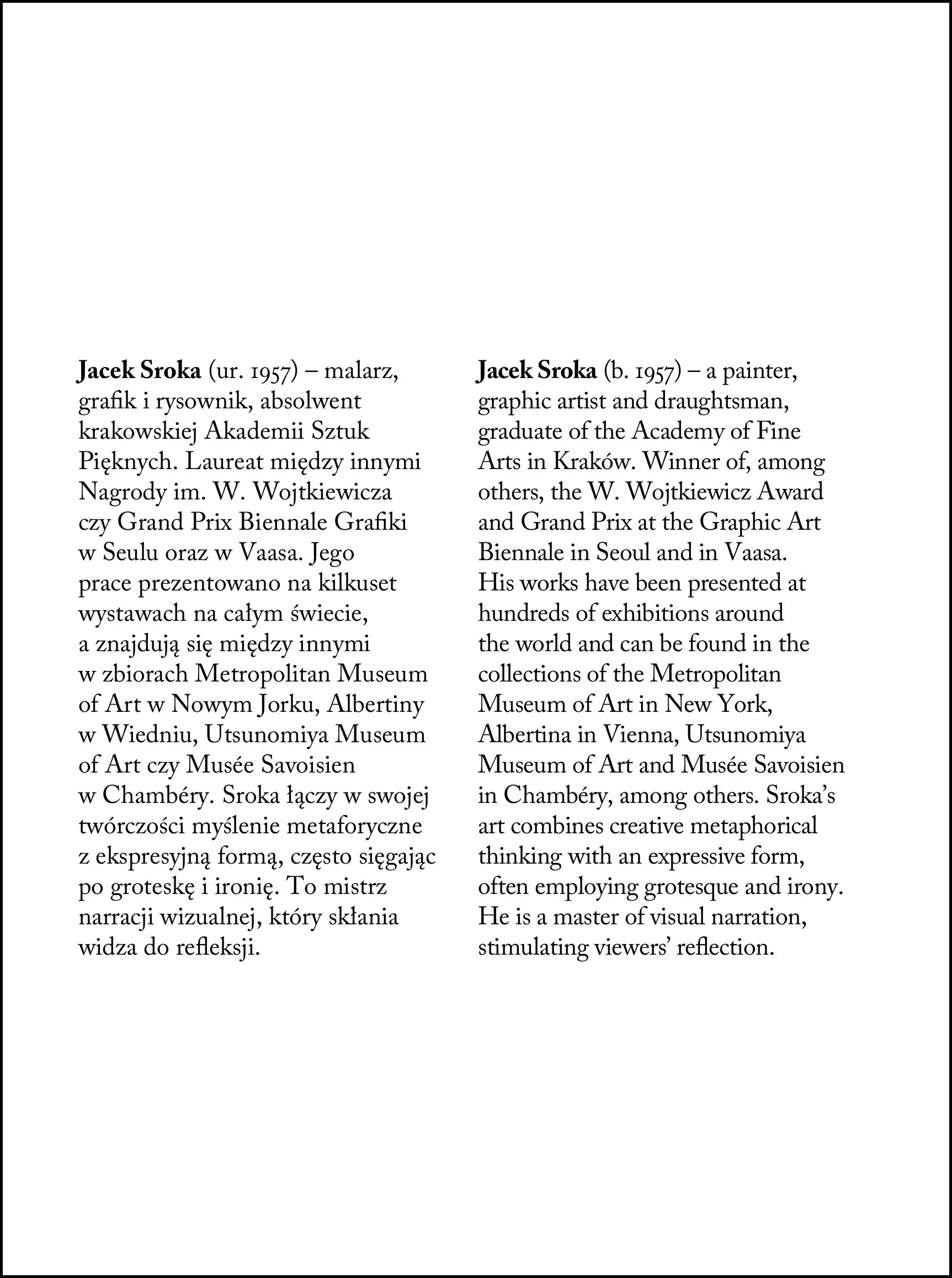 Tomik w serii „Malarstwo”, w który prezentuje obrazy krakowskiego artysty Jacka Sroki. Artysta zajmuje się równocześnie malarstwem i grafiką warsztatową, a jego sztukę można zaliczyć do neoekspresjonizmu. Sroka przed stworzeniem obrazu zawsze najpierw zapisuje swoje pomysły w szkicowniku, „planuje” dzieło oraz wyznacza sobie konkretny cel. W trakcie pracy twórczej ten chłodny zamysł zostaje uzupełniony o niemożliwy do przewidzenia element niespodzianki, który sam artysta nazywa „białą magią”. W jego twórczości odnaleźć można karykaturę, groteskowość oraz ambiwalencje, kiedy np. opowiada o rzeczach ponurych i niemiłych w sposób wyrafinowany i nacechowany pięknem. Jacek Sroka jest laureatem wielu nagród, a jego prace można oglądać w muzeach na całym świecie. W 2022 roku został czynnym członkiem Polskiej Akademii Umiejętności.