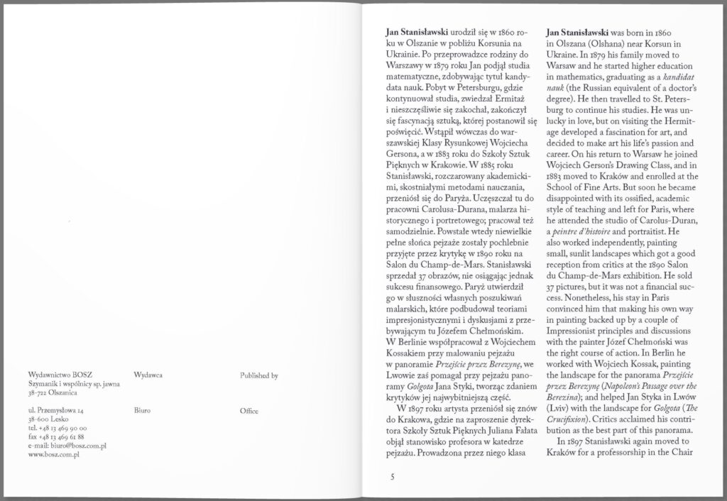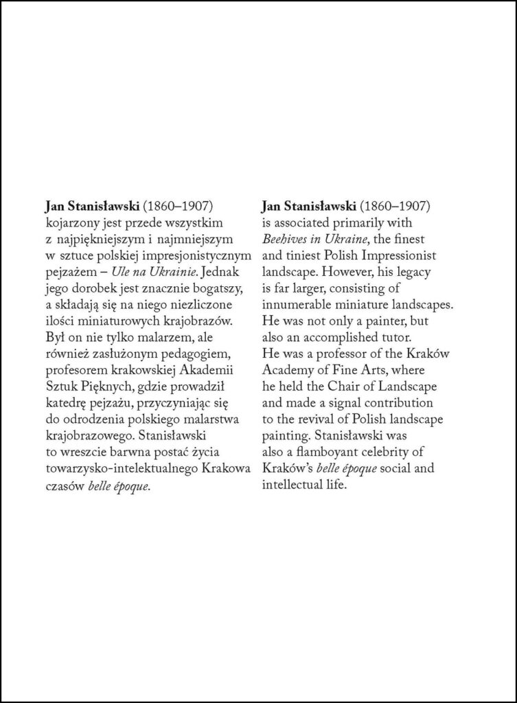 Jan Stanisławski – jeden z najważniejszych malarzy polskiego symbolizmu, twórca tzw. 'krakowskiej szkoły pejzażowej’. Warsztat malarski doskonalił w Paryżu, podróżował również do Włoch, Hiszpanii i Niemiec. Cenił sobie bezpośredni kontakt z naturą, dlatego wybierał malowanie w plenerze zamiast w pracowni. Tworzył przede wszystkim naturalne w swej wymowie pejzaże, m.in. 'Ule na Ukrainie’ (1895), 'Dniepr’ (1903) czy 'Pejzaż z wiatrakami’ (1905). Wstęp do albumu zawierającego najważniejsze dzieła malarza napisała Urszula Kozakowska-Zaucha, historyk sztuki i kustosz Muzeum Narodowego w Krakowie.