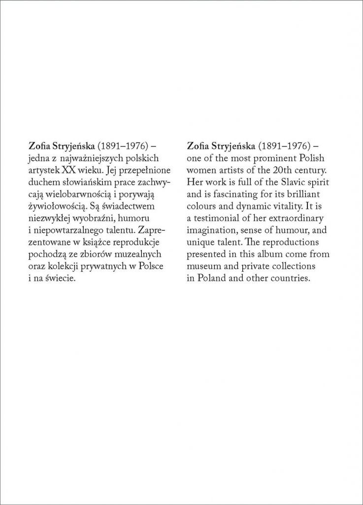 Mini album z serii Malarstwo przedstawia życie i twórczość jednej z najważniejszych i najoryginalniejszych polskich artystek XX wieku – Zofii Stryjeńskiej – „księżniczki malarstwa polskiego”. Jej przepełnione duchem słowiańskim prace zachwycają wielobarwnością i porywają żywiołowością. Są świadectwem niezwykłej wyobraźni, humoru i niepowtarzalnego talentu. Zaprezentowane w książce reprodukcje pochodzą ze zbiorów muzealnych oraz kolekcji prywatnych w Polsce i na świecie.