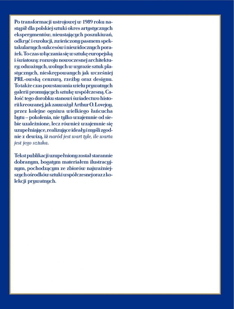 Sztuka polska po 1989 roku to bogato ilustrowany album poświęcony szeroko rozumianej sztuce III Rzeczypospolitej. Książka autorstwa cenionej historyk sztuki, Stefanii Krzysztofowicz-Kozakowskiej, szczegółowo prezentuje największe osiągnięcia polskiej architektury oraz sztuk plastycznych, jakich jesteśmy świadkami po 1989 roku. W albumie przedstawione zostały sylwetki czołowych polskich architektów, artystów i projektantów oraz ich udział w największych międzynarodowych wydarzeniach kulturalnych, a także najważniejsze placówki dbające na co dzień o rozwój i promocję polskiej sztuki, zarówno w kraju, jak również poza jego granicami.