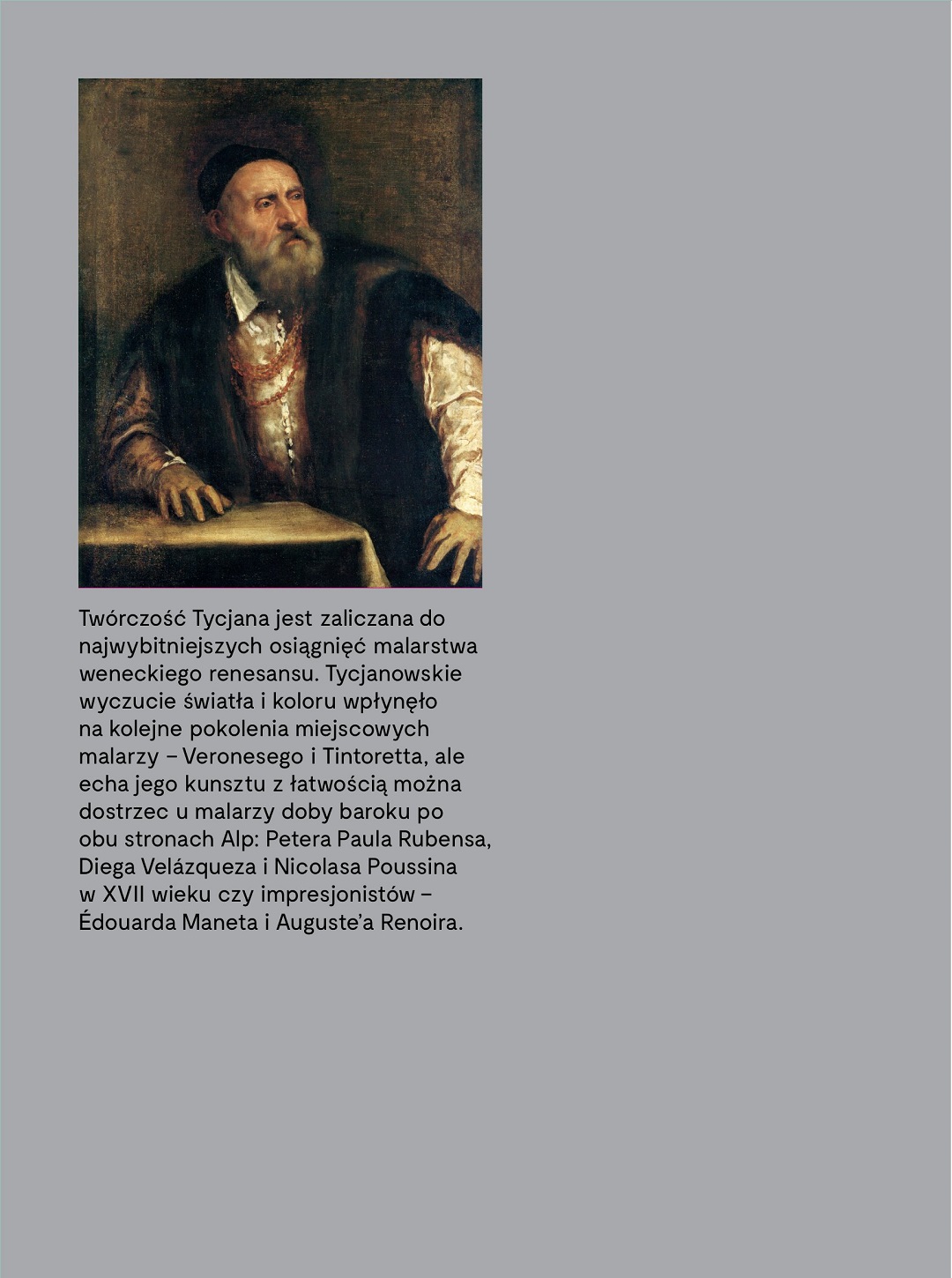 Tycjan, właściwie Tiziano Vecellio, to przedstawiciel weneckiej szkoły malarstwa włoskiego renesansu. Słowo „tycjanowski”, określające kolor rudopomarańczowy, często stosowany przez artystę, pochodzi właśnie od nazwiska artysty. Dorobek artysty wyróżnia harmonia barw i wzmożony ruch kompozycyjny o zrównoważonym renesansowym charakterze. Późniejsza twórczość łączyła większą swobodę malarską z wyraźnym światłocieniem. Niezmiernie ważnymi elementami w malarstwie artysty są obrazy o watkach mitologicznych, a szczególną sławę przyniosły artyście przedstawienia Wenus. Cenione są także portrety. Twórczość Tycjana jest wzorem i inspiracją dla wielu pokoleń artystów niezależnie od epoki w jakiej żyli i stylu w jakim tworzyli.