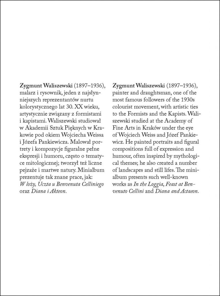 Nowa publikacja w popularnej serii „Malarstwo” przedstawia twórczość Zygmunta Waliszewskiego (1897–1936) – malarza, rysownika, scenografa, jednego z najsłynniejszych reprezentantów nurtu kolorystycznego lat 30. XX wieku. Waliszewski studiował w Akademii Sztuk Pięknych w Krakowie pod okiem Wojciecha Weissa i Józefa Pankiewicza, był artystycznie związany z kapistami i formistami. Malował portrety i kompozycje figuralne cechujące się groteskową ekspresją, tworzył też liczne pejzaże i martwe natury. Minialbum, do którego wstęp napisał Światosław Lenartowicz, prezentuje najbardziej znane prace artysty: „W loży”, „Uczta u Benvenuta Celliniego” oraz „Diana i Akteon”.