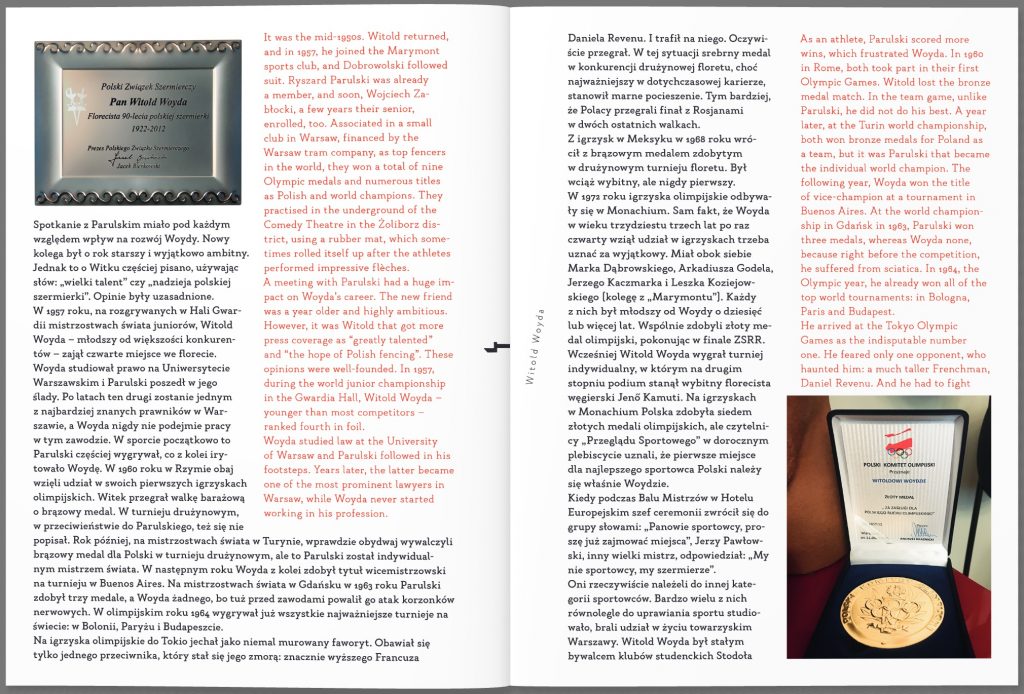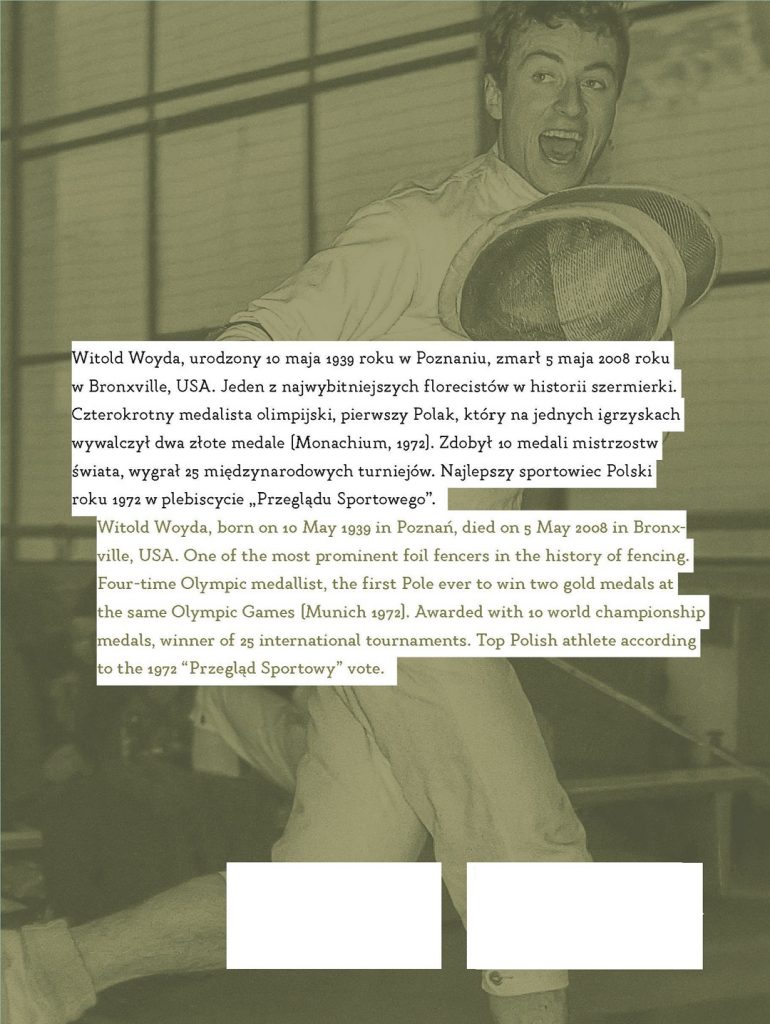 Trzecim po Januszu Kusocińskim i Irenie Szewińskiej bohaterem serii „Medaliści”, powstającej we współpracy z Polskim Komitetem Olimpijskim, jest Witold Woyda (1939–2008) – wybitny polski szermierz, dwukrotny – indywidualny i drużynowy – złoty medalista igrzysk olimpijskich z Monachium (1972). Na wcześniejszych olimpiadach drużynowo zdobył brązowy medal (Meksyk, 1968), a indywidualnie wywalczył srebrny (Tokio, 1964). Życiorys sportowca, podobnie jak w przypadku poprzednich tytułów, przybliżył ceniony dziennikarz sportowy Stefan Szczepłek, a warstwę tekstową uzupełniają wyjątkowe fotografie ze zbiorów Polskiego Komitetu Olimpijskiego.