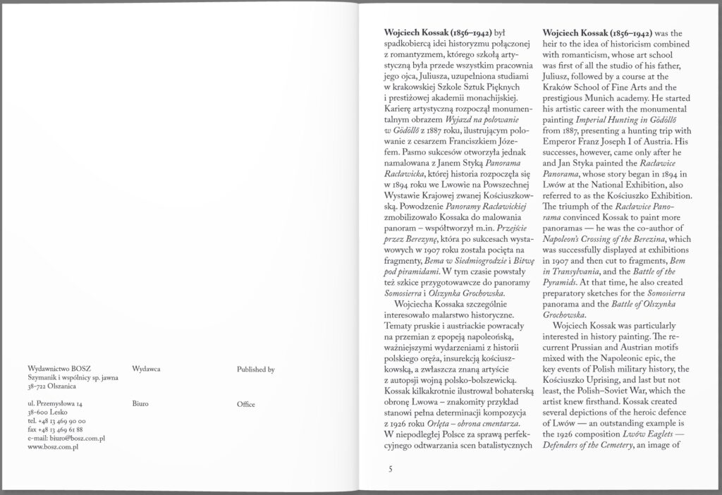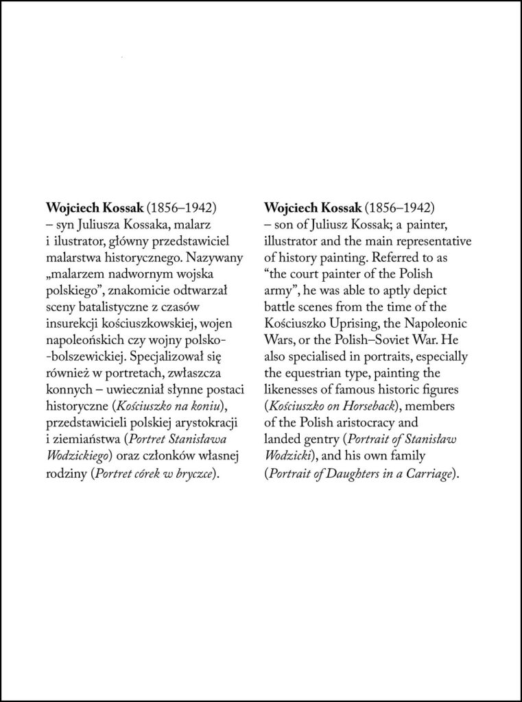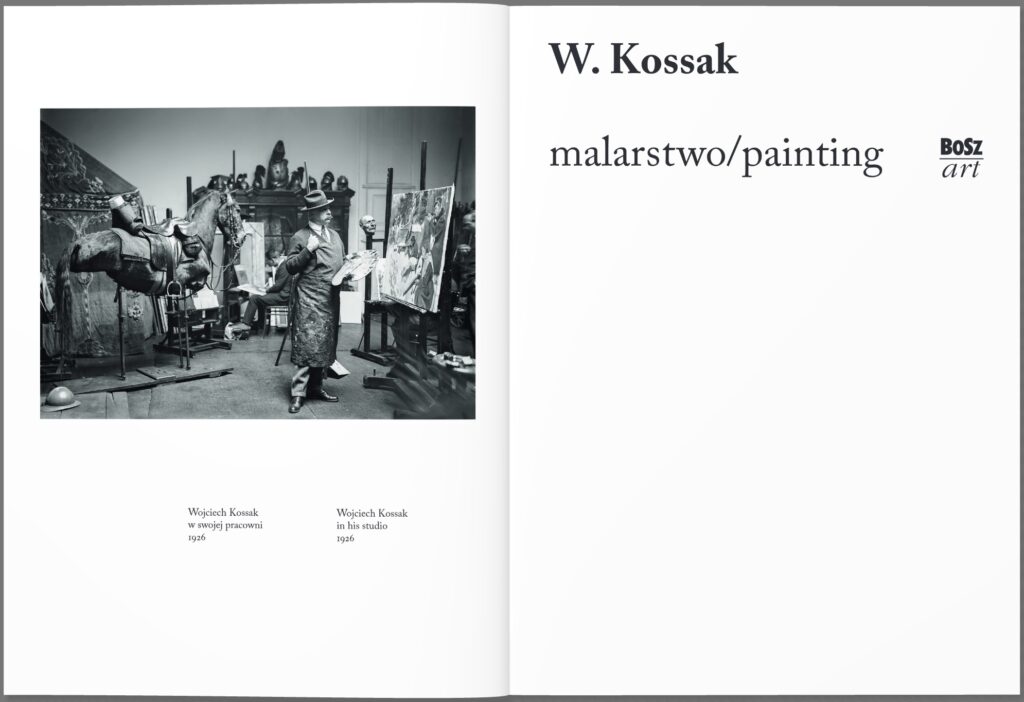Wojciech Kossak – syn Juliusza Kossaka, malarz i ilustrator, główny przedstawiciel malarstwa historycznego. Uczył się w krakowskiej Szkole Sztuk Pięknych oraz akademii monachijskiej, później swój warsztat doskonalił w Paryżu. Jego prace cechuje patriotyzm wyrażany w obrazach przedstawiających walki wyzwoleńcze Polaków oraz sylwetki ważnych postaci w polskiej historii, m.in. 'Kościuszko na koniu’ (1893) czy 'Portret marszałka na Kasztance’ (1928). Ceniony i wielokrotnie nagradzany prezentował swoje prace na wielu wystawach w Polsce i za granicą. Album, opatrzony wstępem autorstwa Stefanii Krzysztofowicz-Kozakowskiej, stanowi przegląd najważniejszych prac artysty.