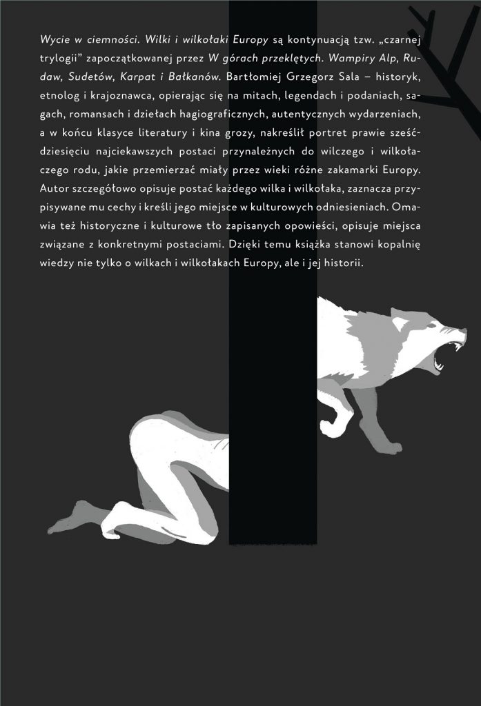 „Wycie w ciemności. Wilki i wilkołaki Europy” stanowi kontynuację tzw. „czarnej trylogii” zapoczątkowanej przez „W górach przeklętych. Wampiry Alp, Rudaw, Sudetów, Karpat i Bałkanów”. Bartłomiej Grzegorz Sala, historyk, etnolog i krajoznawca, opierając się na mitach, legendach i podaniach, sagach, romansach i dziełach hagiograficznych, autentycznych wydarzeniach, a w końcu klasyce literatury i kina grozy, nakreślił portret prawie sześćdziesięciu najciekawszych postaci przynależnych do wilczego i wilkołaczego rodu, jakie przemierzać miały przez epoki różne zakamarki Europy. Autor szczegółowo opisuje postać każdego wilka i wilkołaka, zaznacza przypisywane mu cechy i kreśli jego miejsce w kulturowych odniesieniach. Omawia też historyczne i kulturowe tło zapisanych opowieści, a nawet opisuje miejsca związane z konkretnymi postaciami. Dzięki temu książka stanowi kopalnię wiedzy, nie przestając być przygodą z najciekawszymi wilkami i wilkołakami Europy.
