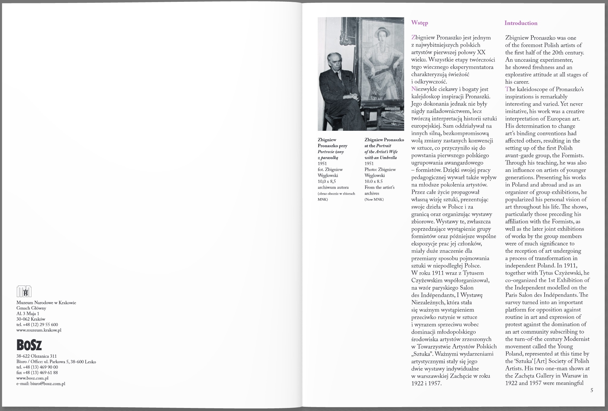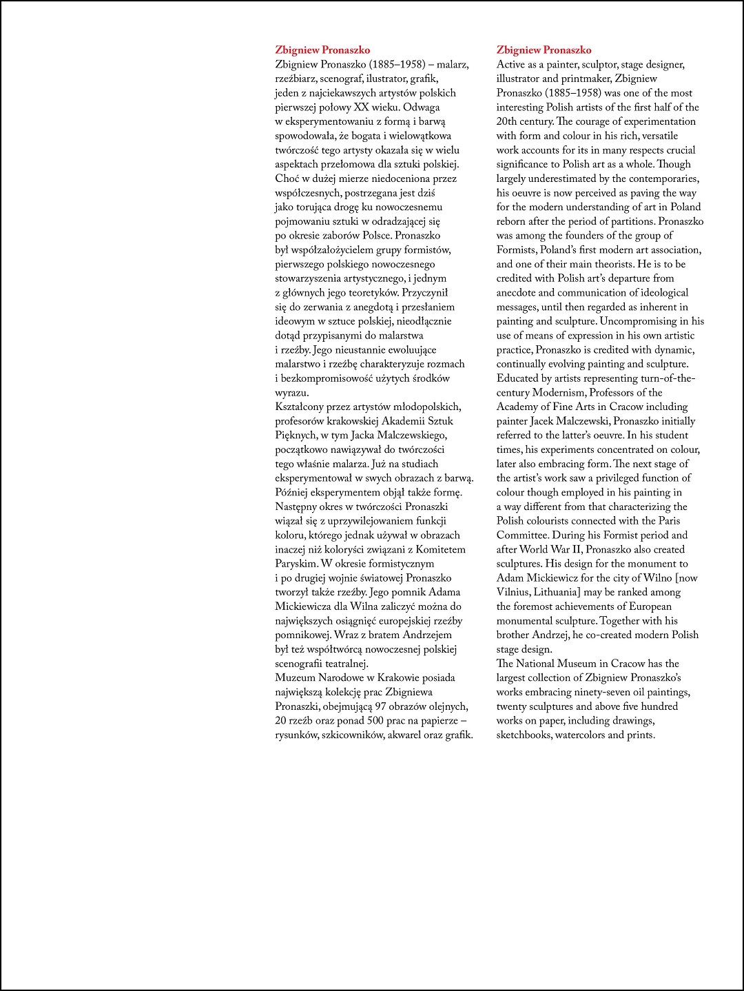 Zbigniew Pronaszko – malarz, rzeźbiarz, scenograf, ilustrator, grafik, jeden z najciekawszych artystów polskich pierwszej połowy XX wieku. Odwaga w eksperymentowaniu z formą i barwą spowodowała, że wielowątkowa twórczość tego artysty okazała się w wielu aspektach przełomowa dla sztuki polskiej. Album prezentuje największą kolekcję dzieł artysty, będącą w posiadaniu Muzeum Narodowego w Krakowie.